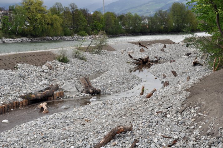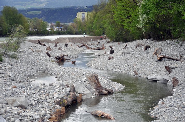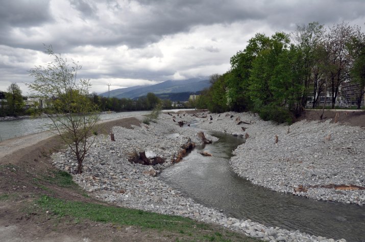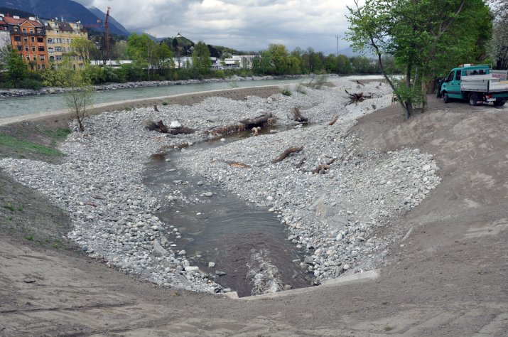 Zur Sohlbeschuppung des Altarmes wurde Material der vorhandenen Schotterbank verwendet. Die bestehende Schotterbank – ein beliebtes Naherholungsgebiet der InnsbruckerInnen – wurde zwar in der Höhe etwas abgesenkt, bleibt aber in ihrer jetzigen Größe und Nutzbarkeit erhalten.