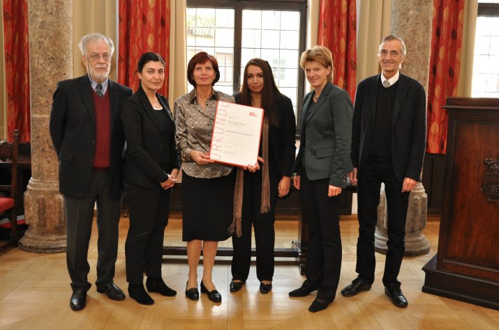Das achte Jahr in Folge verlieh die Stadt Innsbruck am 28. Oktober den Arthur-Haidl-Preis. Der mit 9.000 Euro am höchsten dotierte Förderpreis der Stadt Innsbruck ging heuer an den Verein Sprachinsel – Forum für interkulturelles Lernen. Bürgermeisterin Mag.a Christine Oppitz-Plörer verlieh im festlichen Rahmen des Bürgersaales im Historischen Rathaus den Preis an die Obfrau des Vereins Sprachinsel Mag. Christa Udschi und an die pädagogische Mitarbeiterin Katharina Kessler. Kulturstadträtin Univ.-Prof. Dr. Patrizia Moser nahm an der Feier teil, genauso wie Stadträtin Sonja Pitscheider, Landtagspräsident Prof. Ing. Helmut Mader und acht GemeinderätInnen. Der Akt wurde von Musik des „Salon Balkan“ umrahmt.