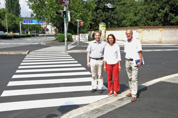 Im Zuge von Belagserneuerungsarbeiten, die von Juni bis September im gesamten Stadtgebiet stattfinden, entstehen auch 18 behindertengerechte Gehsteigabsenkungen. Vizebürgermeisterin Mag.a Sonja Pitscheider, Ing. Martin Mayr (Amt für Tiefbau) und Ing. Martin Exenberger (technischer Behindertenbeauftragter) machten sich am 11. Juli bei der Pfarrkirche Hl. Familie Wilten West ein Bild von einer der zehn im gesamten Stadtgebiet fertig gestellten Arbeiten.