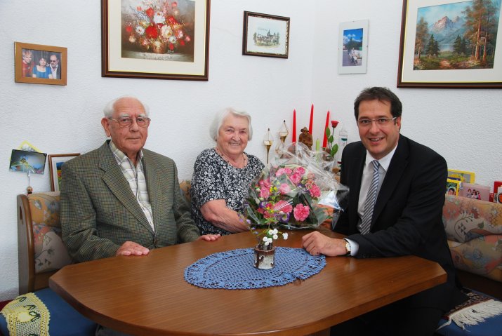Vor 65 Jahren haben sich Hedwig und Franz Kainz kennengelernt, zwei Wochen später traten die beiden vor den Traualtar. Mittlerweile kann das Ehepaar auf ein langes und ereignisreiches gemeinsames Leben zurückblicken. Am 29. Juni 2011 gratulierte Vizebürgermeister Franz X. Gruber den beiden mit einem Blumenstrauß und einer Flasche Wein zur Eisernen Hochzeit.