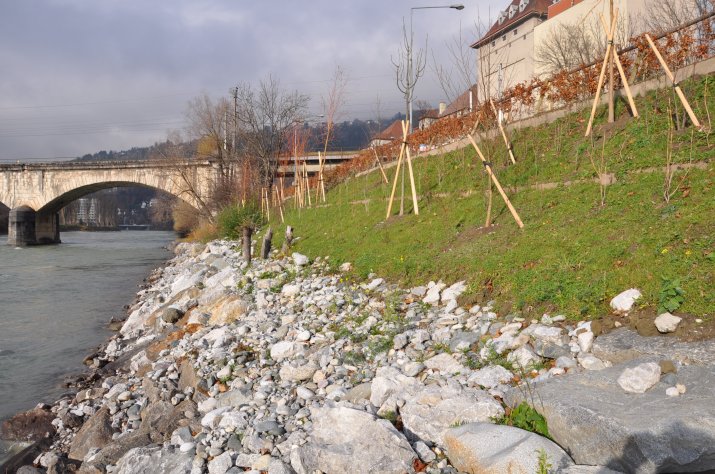 (RMS) Im Rahmen des Gesamtprojektes „Inn-Hochwasserschutz – Sillmündung“ wurde im Winter 2009/2010 am orographisch linken Innufer durch die Innsbrucker Kommunalbetriebe AG ein Kanaldüker unter dem Inn errichtet. Um den Wünschen der BürgerInnen nach einer ansprechenden Wiederherstellung der Uferböschung entlang der Hallerstraße nachzukommen, wurde die Wieder- bzw. Neubepflanzung der Baustelle auf Herbst 2010 vorgezogen. Vizebürgermeister Franz X. Gruber und IKB-Vorstandsvorsitzender DI Harald Schneider präsentierten das Ergebnis dieser Arbeiten am 18. November.