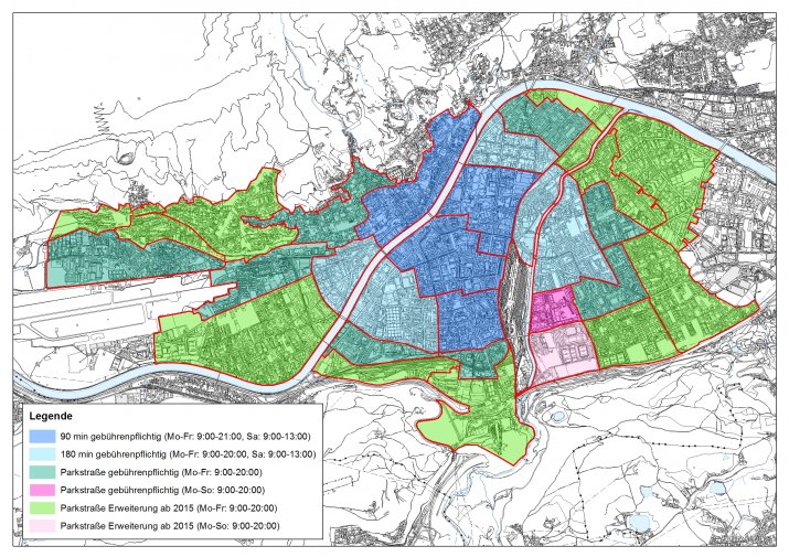 Das bisherige Zonendickicht wird in 90- und 180-Minuten Kurzparkzonen und Parkstraßen umgewandelt. Der Preis beträgt einheitlich 70 Cent für 30 Minuten, in Parkstraßen kann für sieben Euro den ganzen Tag geparkt werden. Bis Ende des Jahres 2014 soll der Parkraum neu geregelt sein. Anschließend werden die Parkstraßen auf weitere Gebiete ausgedehnt.