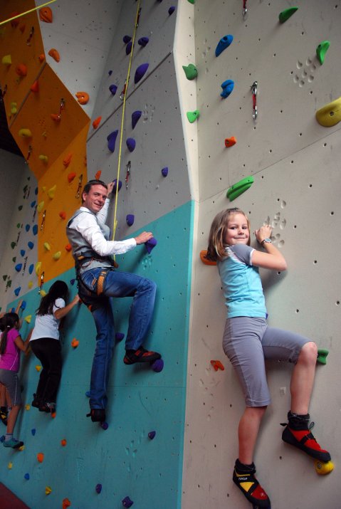 Abschließend testete Vizebgm. Kaufmann noch die neue Wand persönlich und kletterte mit den Kindern gemeinsam.