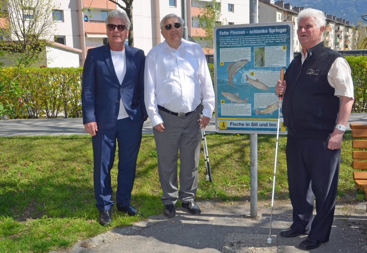 Der an der Sill gelegene Info-Wanderweg für blinde und sehbehinderte Menschen, der in Zusammenarbeit der Stadt Innsbruck und dem Tiroler Blinden- und Sehbehinderten Verband (TBSV) entstand, ist österreichweit einmalig. Nach der Generalüberholung des fünf Kilometer langen Weges vom Sillpark bis zum Baggersee erfolgte am 24. April die Neueröffnung. Aus diesem Anlass machte sich Sozialstadtrat Ernst Pechlaner gemeinsam mit TBSV-Obmann Klaus Guggenberger und Mitwirkenden bei der Gestaltung einen Eindruck von einer der neuen Informationsstationen.