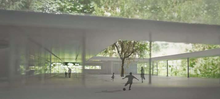 Der zukünftige Kindergarten wird aus einem flachen L-förmigen Baukörper bestehen, der mit zwei weiteren schmalen Dachflächen im Süden und im Westen zu einem rechteckigen Hof verschlossen wird. In der Mitte dieses Rechteckes entsteht eine große baumbestandene Rasenspielfläche für die Kinder. Im Norden an den Eingangsbereich angeordnet, befinden sich der Bewegungsraum sowie die Gruppenräume. Südlich vom Eingang sind die Allgemeinräume wie Küche, Verwaltung und Ruheraum situiert. Die Außen- und Innenflächen fügen sich zu einer stimmigen Gesamtkonzeption auf hohem architektonischen Niveau zusammen.