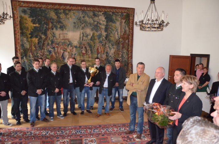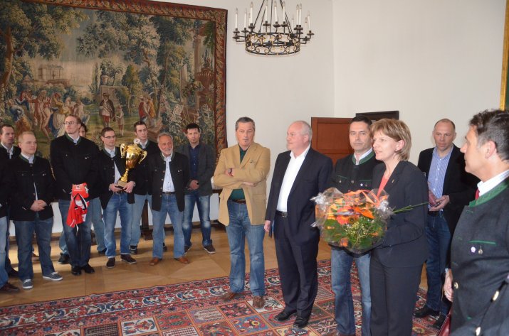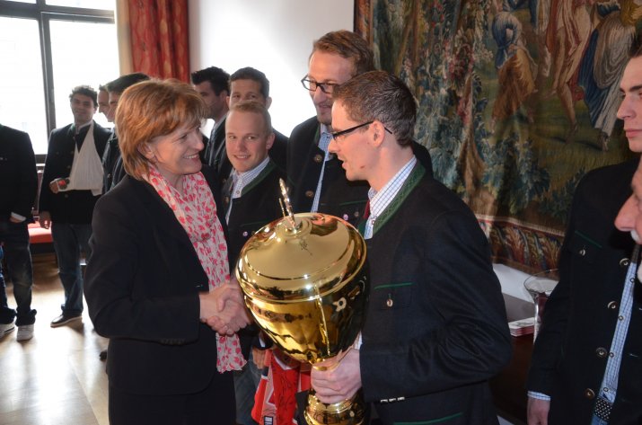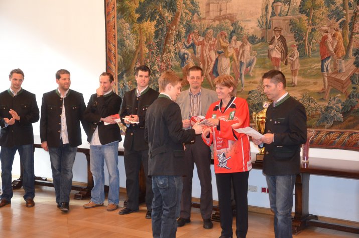 Die Bürgermeisterin überreichte den einzelnen Spielern kleine Geschenke, während die Mannschaft ihrerseits ein von allen Spielern signiertes Mannschaftstrikot übergeben und den gewonnenen Pokal stolz präsentieren durfte.