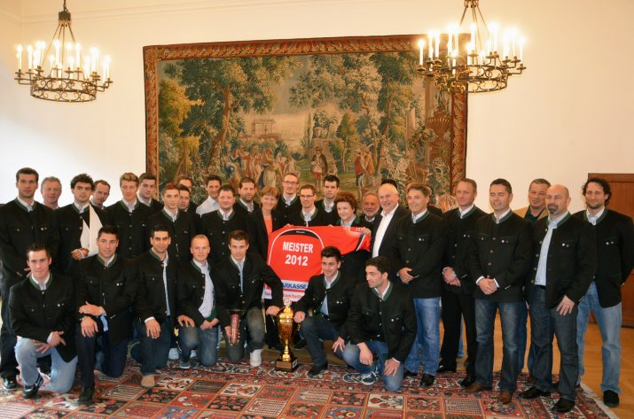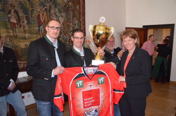 Am vergangenen Samstag sicherten sich die Cracks des Innsbrucker Eishockeyvereins HC Tiroler Wasserkraft Innsbruck „Die Haie“ im Auswärtsspiel gegen AT SE Graz mit einem souveränen 2:5-Sieg den Meistertitel der Österreichischen Nationalliga. Aus gegebenem Anlass empfing Bürgermeisterin Mag.a Christine Oppitz-Plörer die erfolgreiche Mannschaft am 4. April im Bürgersaal des Historischen Rathauses.