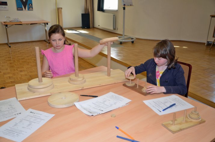 In kleinen Gruppen, unterstützt von Mathematik-Studierenden, wurden die Schulkinder motiviert, in verschiedenen Stationen spielerisch Probleme zu lösen, überraschende Phänomene kennen zu lernen und damit die die Freude an der Mathematik zu entdecken oder zu stärken. Rätseln und Knobeln konnten die Kids bei: