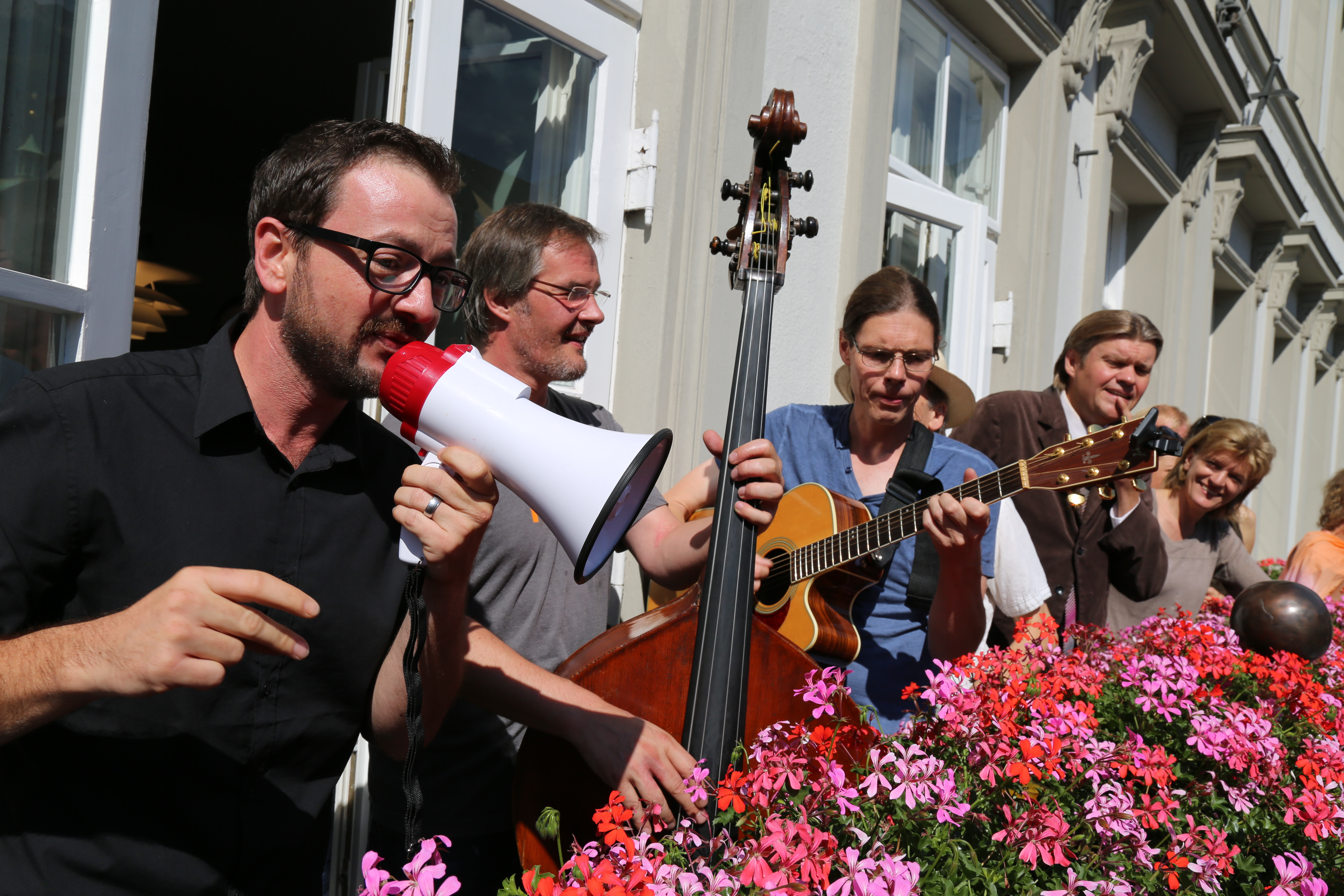 Das Stadtsenatssitzungszimmer bietet normalerweise Raum für politische Diskussionen. Heute wurde es mit Musikinstrumenten, einem Fahrrad und viel Gelächter gefüllt: Rund zwei Dutzend KünstlerInnen des Festivals waren zu Besuch im Rathaus. „Es tut gut, dass in diesem Raum auch einfach einmal nur gelacht wird. Meistens geht es hier weniger laut und musikalisch zu“, begrüßte Bürgermeisterin Mag.a Christine Oppitz-Plörer den Initiator des Festivals, Herbert Waltl mit seinem Ensemble. Nach dem Lied „Tulpen aus Amsterdam“ bekam sie einen großen Blumenstrauß überreicht.