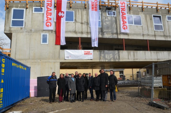 In Anwesenheit von Bürgermeisterin Mag.a Christine Oppitz-Plörer, Vizebürgermeister Christoph Kaufmann, Stadtrat Franz X. Gruber und Dr. Franz Danler (Geschäftsführer Innsbrucker Immobilien Gesellschaft – IIG) wurde am 24. März nun die Firstfeier begangen. Bei den Feierlichkeiten waren auch Dr. Hubert Innerebner (Geschäftsführer Innsbrucker Soziale Dienste GmbH – ISD), Mag. Franz Stelzl (Leiter der Städtischen Herberge), die Architekten Astrid Tschapeller und Michael Steinlechner sowie Dr. Thomas Pühringer und Mag. Markus Stoll (beide IIG-Aufsichtsrat) und zahlreiche Projektbeteiligte anwesend.