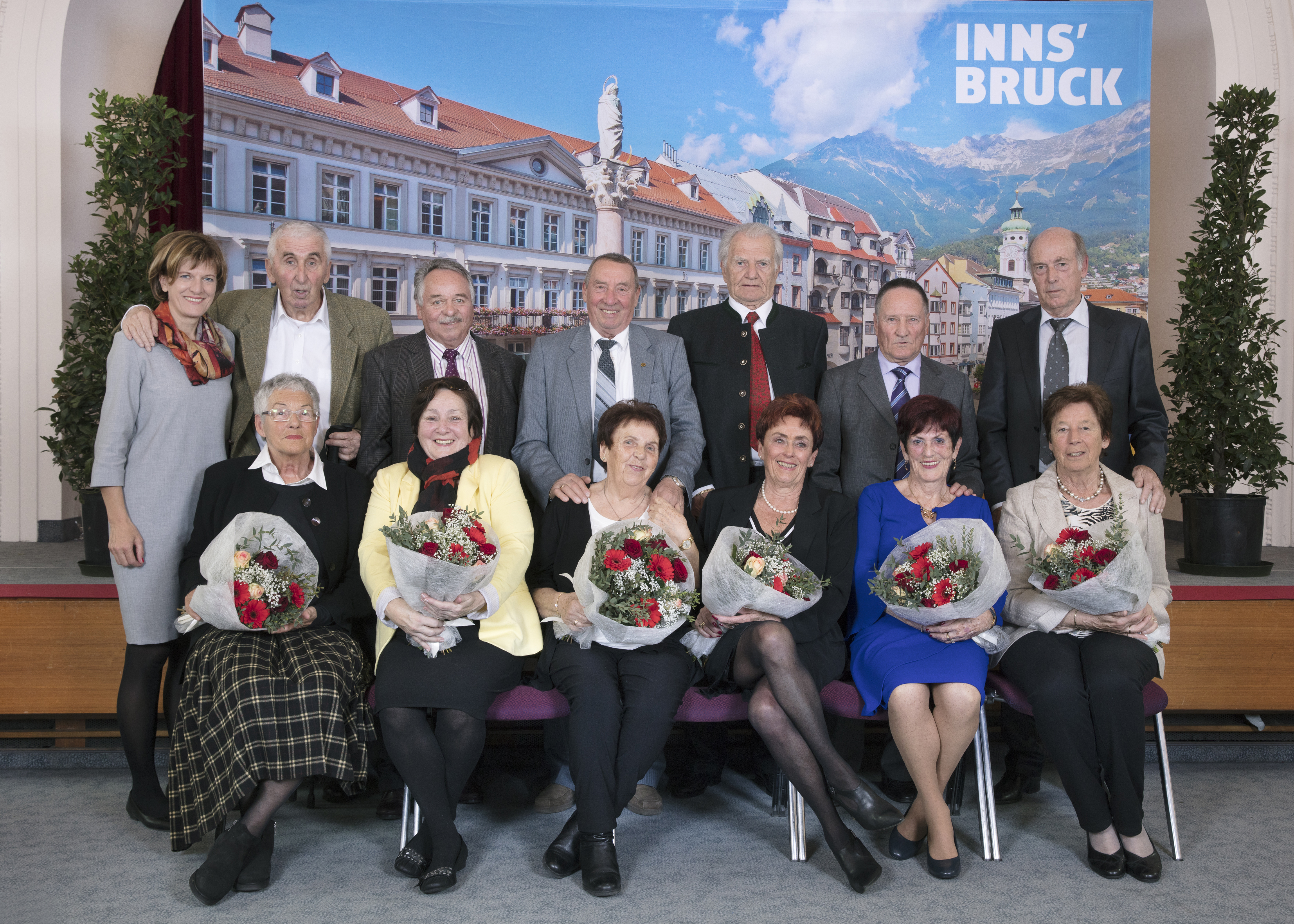 Ein Diamantenes bzw. Goldenes Hochzeitjubiläum ist bewundernswert und deshalb gebührend zu feiern: Insgesamt 23 Jubelpaare kamen am 14. März in die Ursulinensäle, um gemeinsam – auf Einladung der Stadt Innsbruck – ihre Hochzeitsjubiläen zu feiern. Bürgermeisterin Mag.ª Christine Oppitz-Plörer gratulierte den Jubelpaaren zu ihren langjährigen Eheversprechen und überreichte ihnen die Jubiläumsgabe des Landes Tirol sowie einen Blumenstrauß.