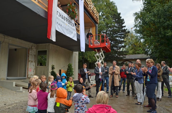 Die Stadt Innsbruck baut insbesondere im Bereich der städtischen Kindergärten und Schülerhorte das Angebot laufend familienfreundlich aus. Der Kindergarten Innerkoflerstraße ist einer der 27 städtischen Kindergärten. Um auch hier den stetig steigenden Bedarf an Betreuungsplätzen abdecken zu können, wird die bestehende Betreuungsstätte vergrößert. Der Kindergarten wird um zwei Kindergartengruppen – von vier auf sechs Gruppen – erweitert. Im Frühsommer erfolgte der Baustart, am 26. September wurde nun, nachdem der Rohbau fertiggestellt wurde, die Firstfeier begangen.