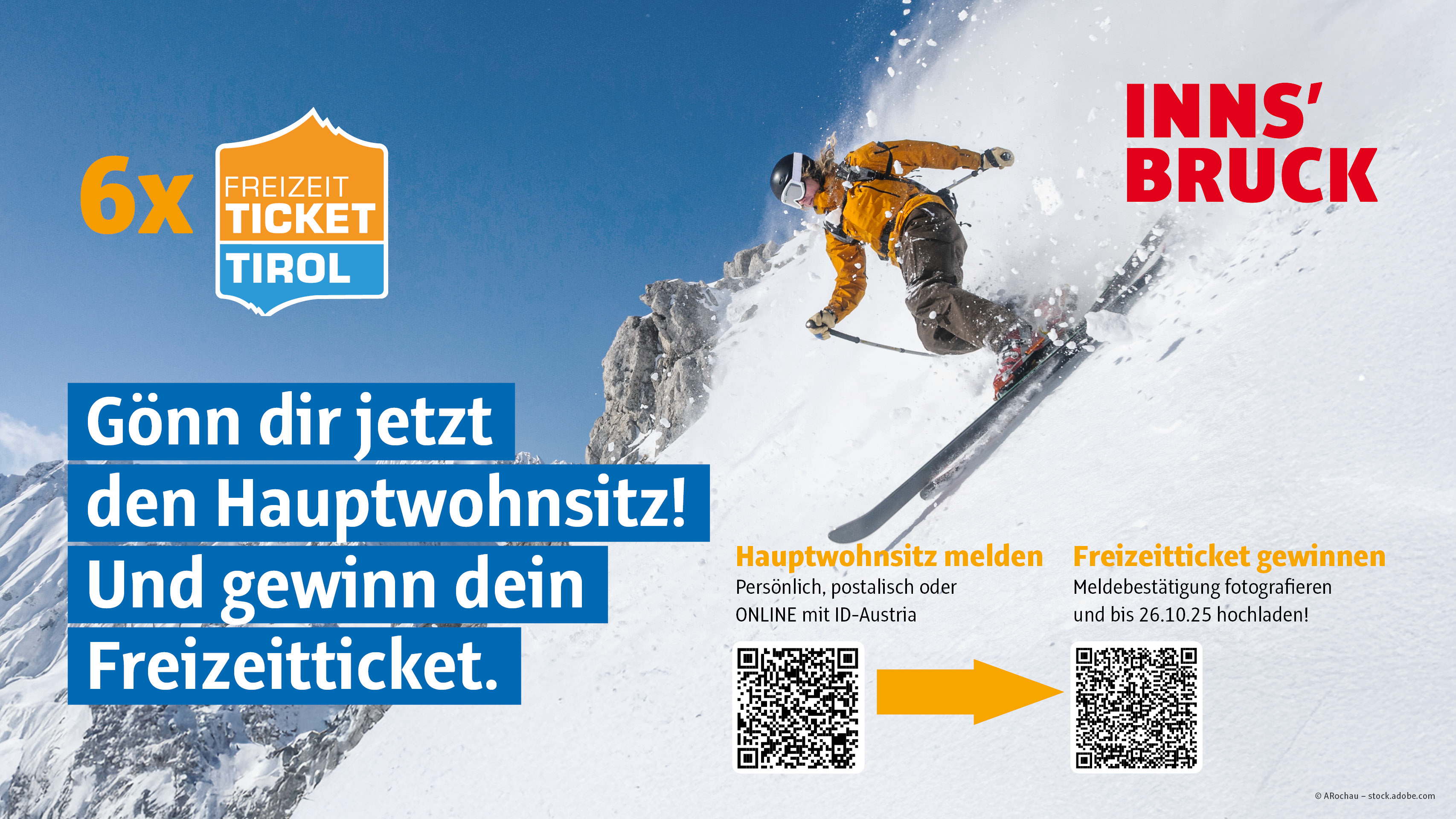 Alle neuen Hauptwohnsitzmeldungen in der Stadt Innsbruck von 22. September bis 26. Oktober 2025 haben die Möglichkeit, eines von sechs Freizeittickets zu gewinnen!