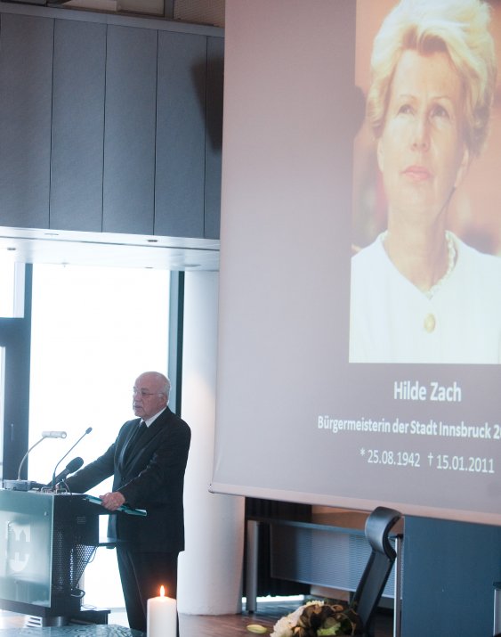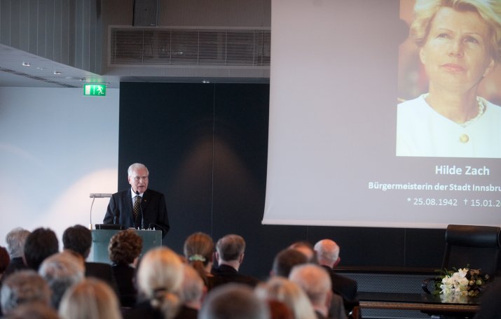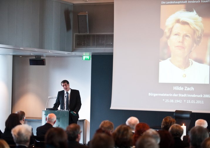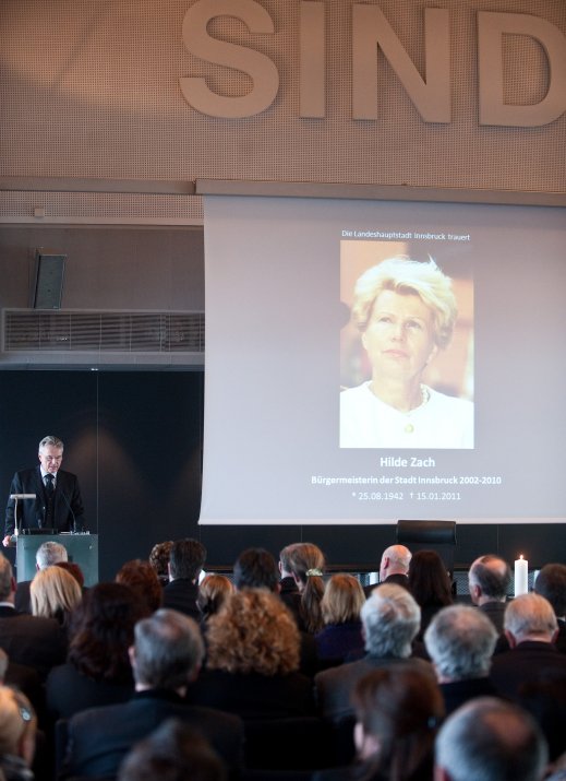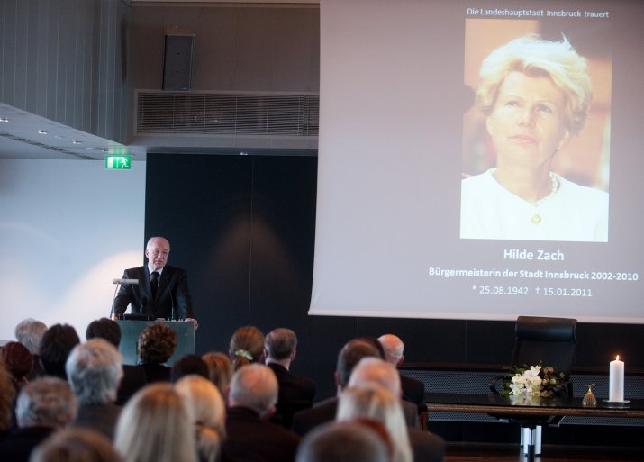 Bürgermeisterin Mag.a Christine Oppitz-Plörer dankte ihrer verstorbenen Amtsvorgängerin in einer bewegenden Rede für ihr Lebenswerk: „Hilde Zach ist mutig und konsequent ihren ganz eigenen Weg gegangen und hat viele sichtbar und spürbare Spuren in unserer Stadt hinterlassen. Sie war wesentlicher Motor, Innsbruck ein modernes Gesicht und ein weltoffenes Lebensgefühl zu geben.“ Hilde Zach habe sich mit ihrem unbändigen und umsichtigen Einsatz für die Agenden der Stadt und der immer spürbaren Sympathie, die sie den Menschen entgegen brachte, in den acht Jahren als Bürgermeisterin der Tiroler Landeshauptstadt die Liebe der Innsbruckerinnen und Innsbrucker im wahrsten Sinne des Wortes erarbeitet. „Wirtschaft mit Weitblick, Kultur als Herzensangelegenheit und Politik aus Leidenschaft – Hilde Zach zeichnete sich in allen Bereichen, in denen sie tätig wurde, durch herausragende Leistungen aus. Das brachte ihr großen Respekt ein, weit über alle Parteigrenzen hinweg“, so Bürgermeisterin Oppitz-Plörer. Hilde Zach habe mit ihrer pflichtbewussten Auffassung von Politik der Innsbrucker Stadtpolitik und dem Gemeinderat ein neues Selbstbewusstsein gegeben. „Hilde Zach war Bürgermeisterin mit Leib und Seele: Sie lebte die Politik, sie mochte die Menschen und sie liebte ihre Stadt, ihr Innsbruck! Ihr leidenschaftlicher Einsatz für Innsbruck, ihr Mut und Rückgrat, ihr Durchsetzungsvermögen und nicht zuletzt ihr soziales Wirken, ihr Verständnis, ihre Toleranz und ihrer Hilfsbereitschaft waren beispielhaft.“