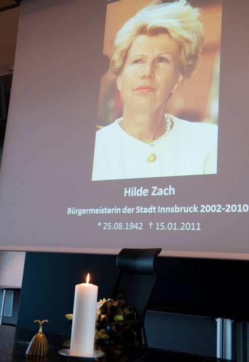 Der Gemeinderat der Stadt Innsbruck trat am 19. Jänner im Beisein der Trauerfamilie zu einer öffentlichen Trauersitzung im Plenarsaal zusammen. Die Gemeinderatsfraktionen erwiesen im Rahmen der Sondersitzung der am 15. Jänner verstorbenen Alt-Bürgermeisterin und Ehrenbürgerin Hilde Zach über die Parteigrenzen hinweg in sehr emotionalen und persönlichen Worten ihre Hochachtung. Der Platz, den Hilde Zach acht Jahre lang als Bürgermeisterin von Innsbruck einnahm, vorne in der Mitte des Plenarsaals blieb leer, geschmückt mit einem Blumenstrauß und einer Kerze, dahinter wurde ein Bild der Altbürgermeisterin projiziert.