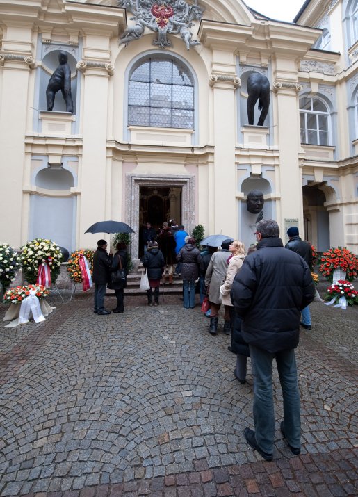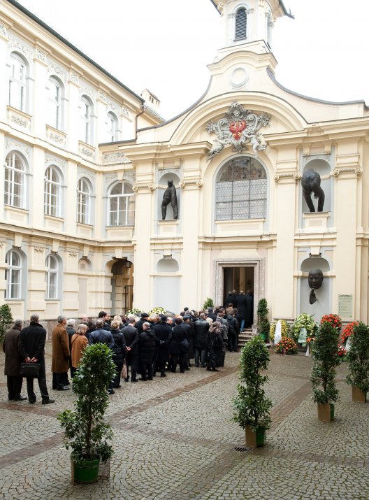 Im Anschluss an die Trauersitzung begab sich die Trauerversammlung in die St.-Georgs-Kapelle im Alten Landhaus, wo die Verstorbene derzeit aufgebahrt ist, um gemeinsam mit den Mitgliedern der Tiroler Landesregierung von Hilde Zach Abschied zu nehmen und sich in das Kondolenzbuch einzutragen.