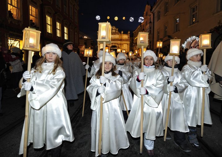 Um 17 Uhr setzt sich dann der feierliche Zug in Bewegung. Von der Triumphpforte führt der Weg über Maria-Theresien-Straße, Marktgraben, Herzog-Otto-Straße und Herrengasse bis zum Platz vor dem Tiroler Landestheater und bietet so reichlich Gelegenheit, den gesamten Zug zu bestaunen. Die Hirten und Engel mit ihren Laternen bringen einen warmen Lichterglanz in die Innenstadt und bereiten den Weg für das Christkind in seinem strahlenden, prunkvollen Wagen. An zwei Stationen (Rathaus, ca. 17.20 Uhr, und Marktplatz, ca. 17.40 Uhr) werden die traditionellen Lieder „Jetzt fangen wir zum Singen an“, „Kommet ihr Hirten“ und „Es wird scho glei dumpa“ gesungen, die sich als vorweihnachtliche Klangwolke über die Innsbrucker Innenstadt legen.