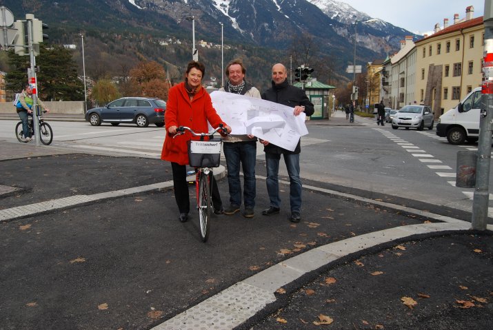 Die Anbindung des Radweges vom Herzog-Siegmund-Ufer zur Herzog-Otto-Straße über den Marktplatz ist bald komplett: „In den kommenden Wochen wird damit eine große Lücke im Innsbrucker Radwegenetz geschlossen“, berichtete die Tiefbaustadträtin Dr. Marie-Luise Pokorny-Reitter, die das Projekt am 10. November gemeinsam mit Christian Schoder und Ing. Reinhard Rogen (beide Amt für Tiefbau) vorstellte.