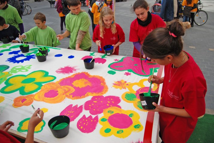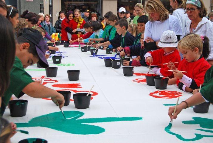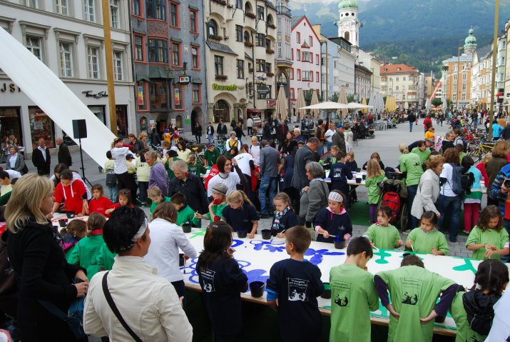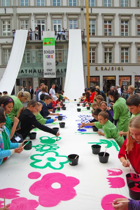 (RMS) Buntes Treiben vor dem Rathaus: Rund 100 Kinder aus den Innsbrucker Schülerhorten versammelten sich in der Maria-Theresien-Straße, um Stoffbahnen mit bunten Blumen zu bemalen. Diese werden in Folge vom Balkon des Rathauses wehen und damit die Fußgängerzone verzieren. Vizebürgermeister Christoph Kaufmann und Stadträtin Dr. Patrizia Moser begrüßten die Kinder und ihre BetreuerInnen bei angenehmem Herbstwetter.