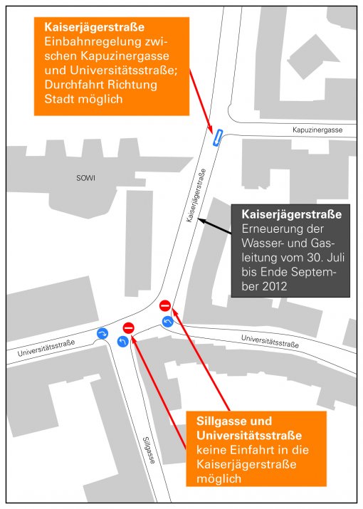 Ab 30. Juli 2012 wird die Wasserleitung auf einem Abschnitt von ca. 140 m Länge in der südlichen Kaiserjägerstraße zwischen Kapuzinergasse und Universitätsstraße erneuert.
