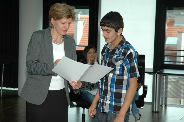 Die 44 Kinder, die an der Kompetenzwerkstatt teilgenommen hatten, erhielten Kompetzen-Zertifikate. Überreicht wurden die Auszeichnungen durch Bürgermeisterin Mag.a Christine Oppitz-Plörer. „Sich seiner Stärken bewusst zu sein hilft, Selbstbewusstsein und Selbstvertrauen zu gewinnen, und damit gerüstet für die Berufswahl und das spätere Leben zu sein“, zeigte sich die Bürgermeisterin überzeugt. An der Zertifikatsverteilung nahmen auch die Projektpartner Univ.-Prof. Dr. Bjorn Ludwig (Zukunftszentrum Tirol), Univ.-Prof. Dr. Werner Mayer (Pädagogische Hochschule Tirol), KR Martin Schaffenrath (AK-Tirol) sowie Notburga Troger (Integrationsstelle Stadt Innsbruck) teil. Außerdem waren Bezirksschulinspektor Ferdinand Treml, Direktorin OSR Helene Rudig sowie die KlassenlehrerInnen und „Coaches“ gekommen. Durch die Veranstaltung führten die beiden Schülerinnen Melanie und Denise, die mit ihren Moderations-Stärken beeindruckten.