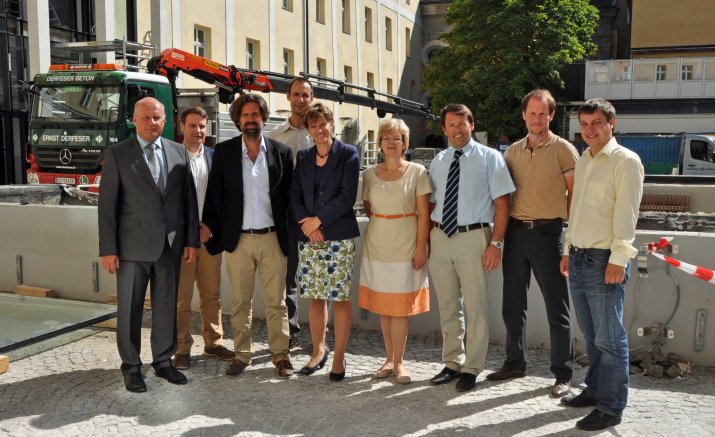 Im Innenhof des BG/BRG Adolf-Pichler-Platz ließen sich die Bürgermeisterin und der IIG-Geschäftsführer die Bauarbeiten für die Gebäudeerweiterung erklären und zeigen. Anwesend waren dabei nicht nur Architekt Dipl. Ing. Axel Birnbaum und Projektleiter Dipl. Ing. Richard Heiser sowie Projektbeteiligte, sondern auch Direktorin Prof. Evelin Müller-Bürgel und Landesschulratsdirektor HR Dr. Reinhold Raffler.