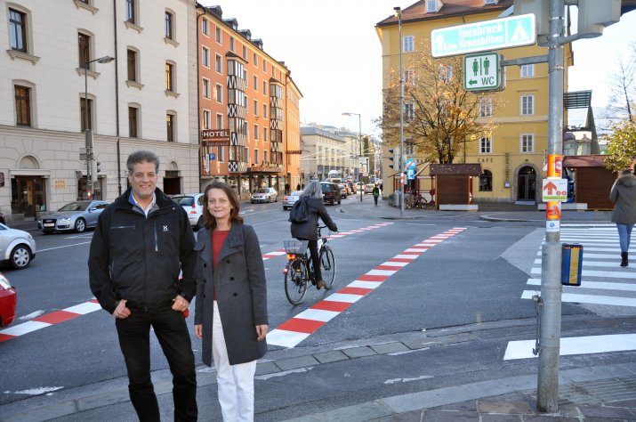 „Hierbei handelt es sich um eine sehr komplexe, stark frequentierte Kreuzung, die auch für AutofahrerInnen unangenehme Situationen bereithält“, so die für Mobilität zuständige Vizebürgermeisterin Mag.a Sonja Pitscheider. „Deshalb haben wir hier versucht, den Radfahrstreifen besser sichtbar zu machen und so die Sicherheit für alle VerkehrsteilnehmerInnen zu erhöhen.“