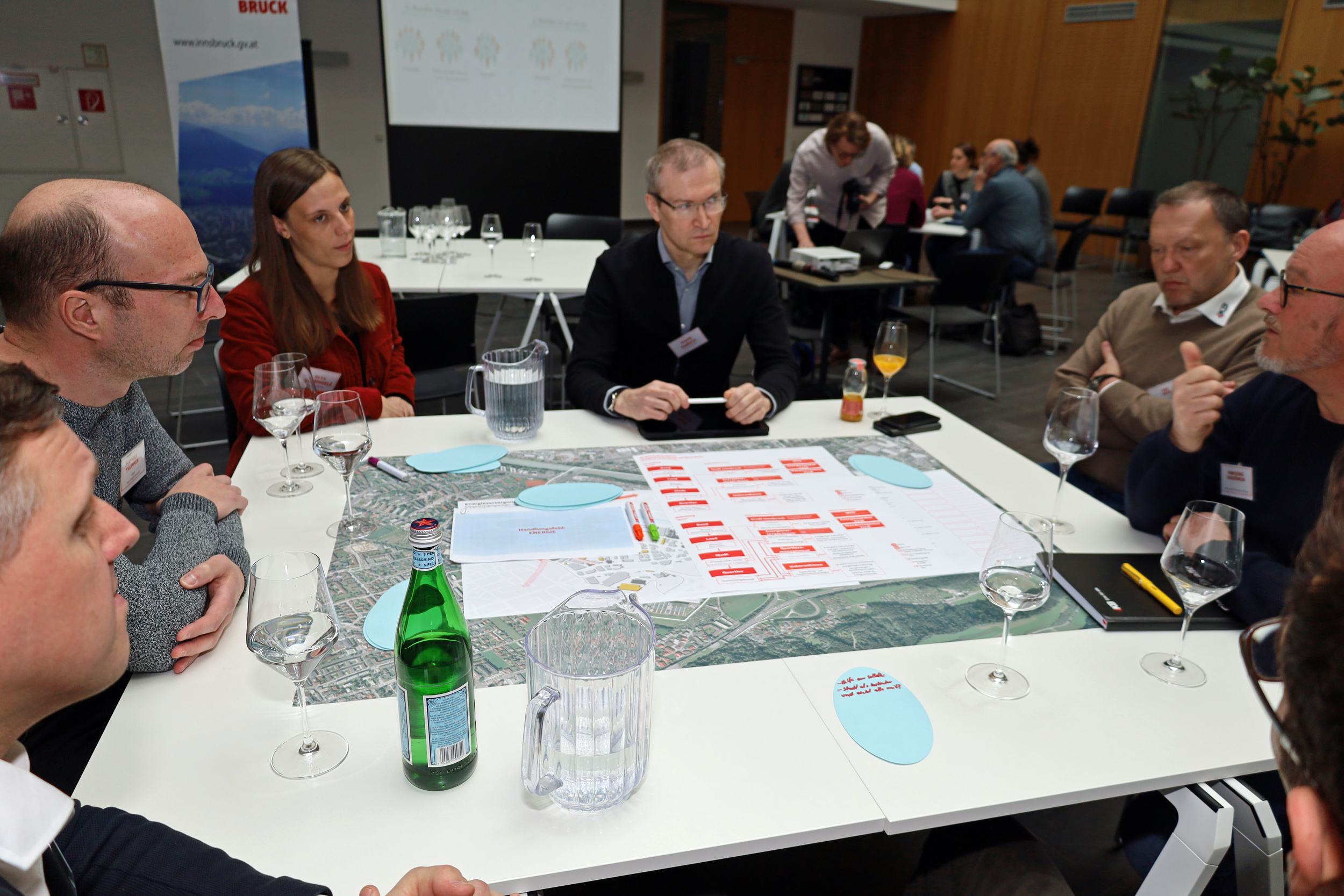 Im Rahmen einer „Werkstatt vor Ort“ im Competence Center Innsbruck informierte das externe Team rund um das Wiener Planungsbüro „Raumposition“ über den Zwischenstand des Entwicklungskonzepts für die Rossau. Zudem wurde in Arbeitsgruppen mit VertreterInnen der Verwaltung und stadtnaher Betriebe sowie interessierten UnternehmerInnen das Zukunftsbild für die Rossau konkretisiert. Auf Basis dieser konsensualen Zielsetzung wurden explizite Umsetzungsmaßnahmen vorgeschlagen und verdichtet, welche Bestandteil eines kurz-, mittel- und langfristigen Arbeitsprogramms sein sollen.