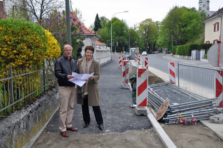 Besonders stark frequentierte Wege sollen nun kontinuierlich saniert und asphaltiert werden. Tiefbaustadträtin Dr. Marie-Luise Pokorny-Reitter stellte am 14. April gemeinsam mit Ing. Martin Mayr (Tiefbauamt) den ersten Bauabschnitt in der Kaiserjägerstraße vor.