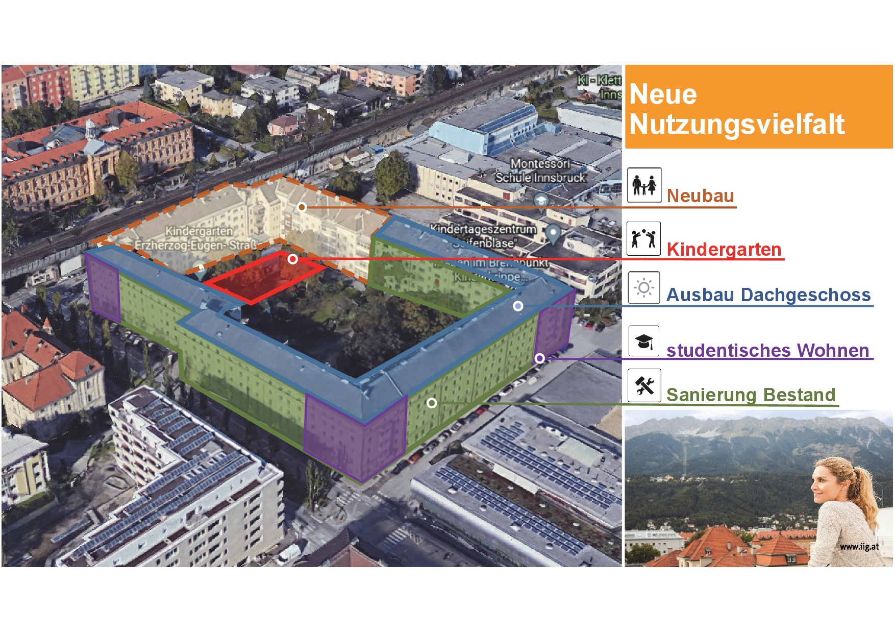 Von den bestehenden 209 Wohnungen steht aktuell knapp die Hälfte frei. Diese können (general)saniert und Bestandswohnungen mit Balkonen aufgewertet werden. Jedes Stiegenhaus in den verbleibenden Bestandsgebäuden bekommt im Innenhof einen Aufzug. Die Gebäude in der Ingenieur-Etzel-Straße 24, 26 und 28 sowie in der Schlachthofgasse 2, 4 und 6 würden abgebrochen und neugebaut. Die verbleibenden drei Eckgebäuden bieten Platz für studentisches Wohnen und im Innenhof soll ein dreigruppiger Kindergarten errichtet werden. Zudem wird im nördlichen Bereich des Innenhofs eine Tiefgarage eingeplant. „Wir wollen eine Weiterentwicklung des Areals zusammen mit dem Sachverständigenbeirat für Stadt- und Ortsbildschutz sicherstellen. Dieser sieht die Pläne positiv und beteiligt sich deshalb daran“, betont der Arbeitsgruppen-Vorsitzende Buchacher. Der Vorsitzende des Innsbrucker Bauausschusses, Gemeinderat Mag. Lucas Krackl, erklärt: „Der Erhalt der straßenseitigen Fassade und damit die Sanierung großer Teile des Schlachthofblocks war einer Mehrheit im Gemeinderat besonders wichtig, auch wenn das aus rein wirtschaftlicher Betrachtung mehr als kritisch gesehen werden muss. Mit dem geplanten Architektenwettbewerb soll jedenfalls ein qualitätvolles Zusammenspiel von Bestand und Neubau erreicht werden.“