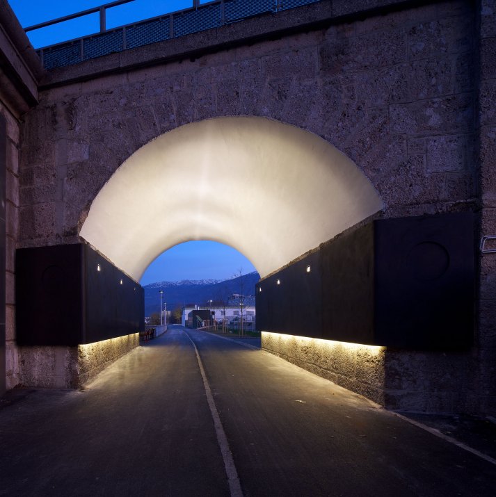 In Kooperation mit der Stadt Innsbruck, die das Radwegenetz kontinuierlich ausbaut, haben die Österreichischen Bundesbahnen den Durchfahrtsbogen zur Ing.-Etzel-Straße zu einem strahlenden Lichtbogen umfunktioniert – nach Vorbild des bereits adaptierten Durchfahrtsbogen an der Kapuzinergasse. An den Seitenwänden wurden Stahltafeln aufgesetzt, die die Beleuchtungskörper unsichtbar aufnehmen und den Bogen mit speziell entwickelten Reflektoren gleichmäßig und homogen aufhellen. In den Nachtstunden bildet der Bogen so ein weithin sichtbares Orientierungssignal. Die Kosten für die Installation teilten sich ÖBB und Stadt Innsbruck.