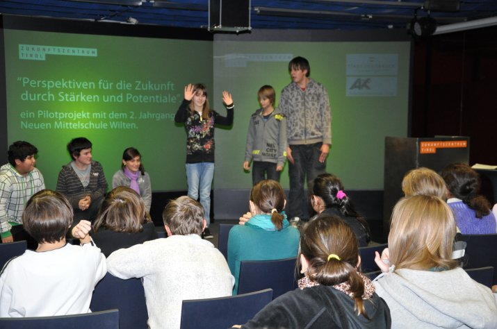 Die Stärken und Kompetenzen jedes und jeder einzelnen SchülerIn zu erkennen und zu fördern und damit Perspektiven für die Zukunft zu eröffnen: Das ist erklärtes Ziel eines neuen Projekts der Stadt Innsbruck gemeinsam mit dem Zukunftszentrum Tirol und der Pädagogischen Hochschule Tirol. Die InitiatorInnen Notburga Troger (Integrationsstelle Stadt Innsbruck), GF Dr.-Ing. Bjørn Ludwig (Zukunftszentrum) und Dir. Dr. Werner Mayr (PHT) stellten den dafür ausgewählten Schulklassen der Neuen Mittelschule Wilten das Projekt am 17. Dezember vor.