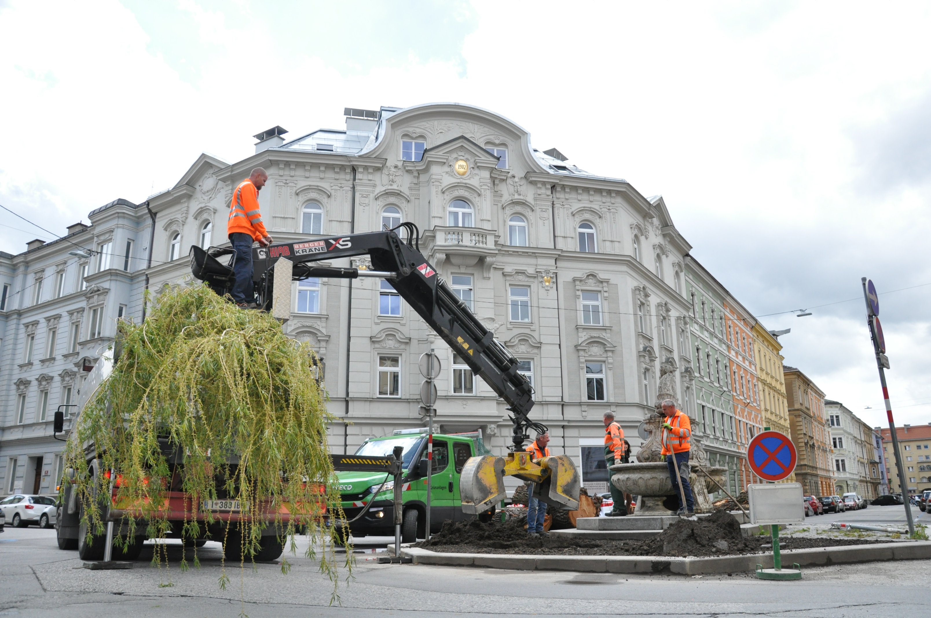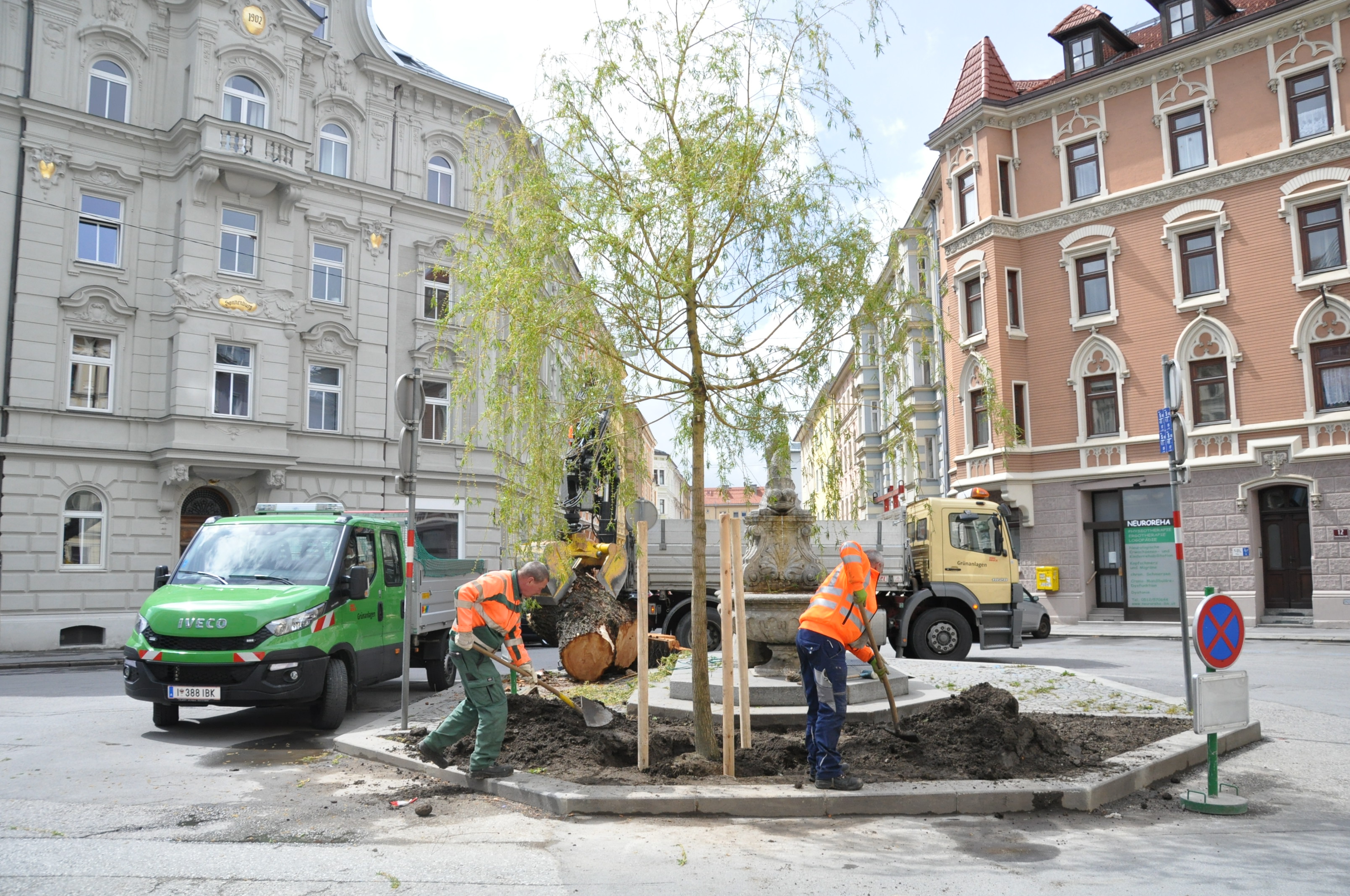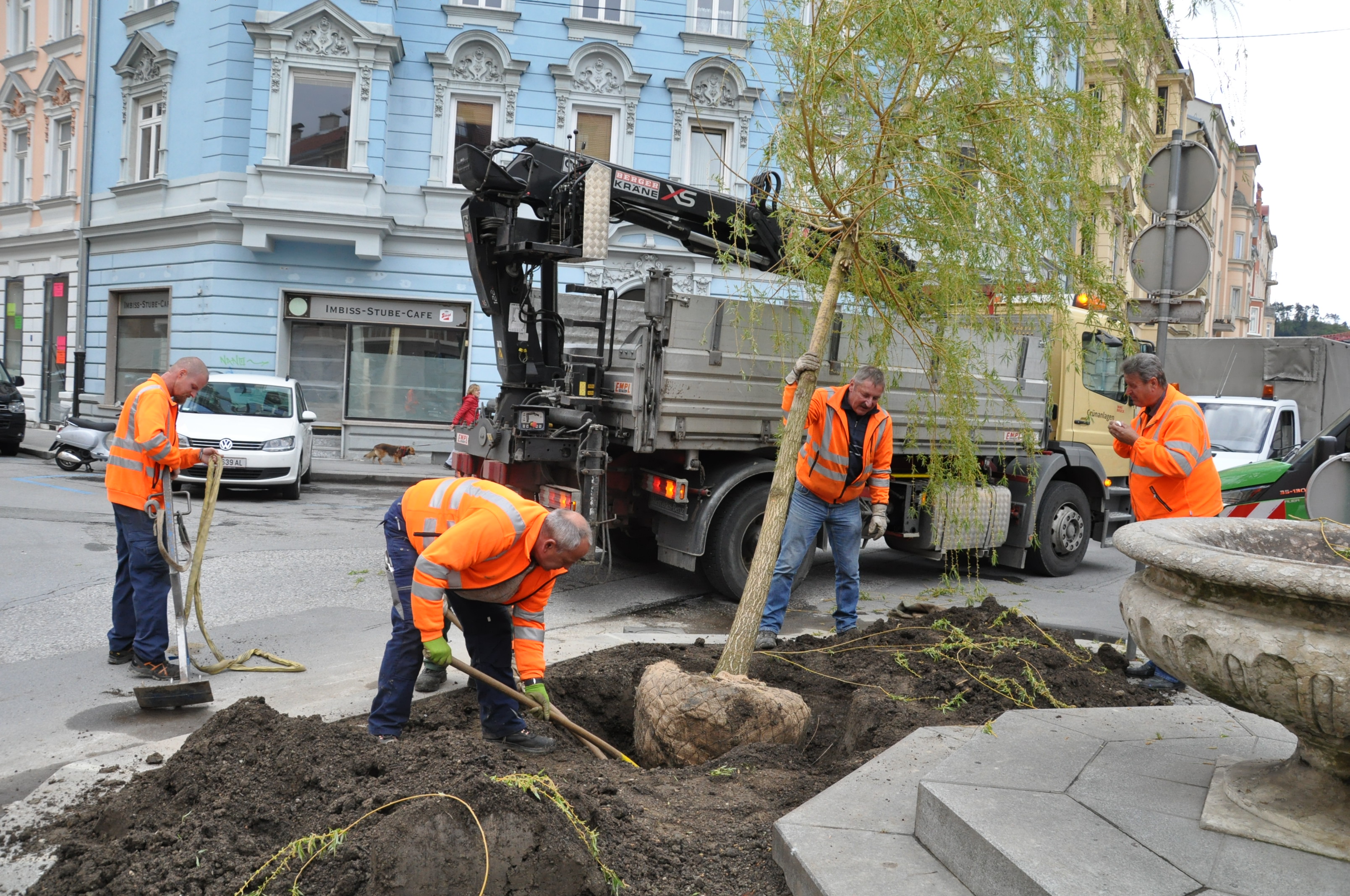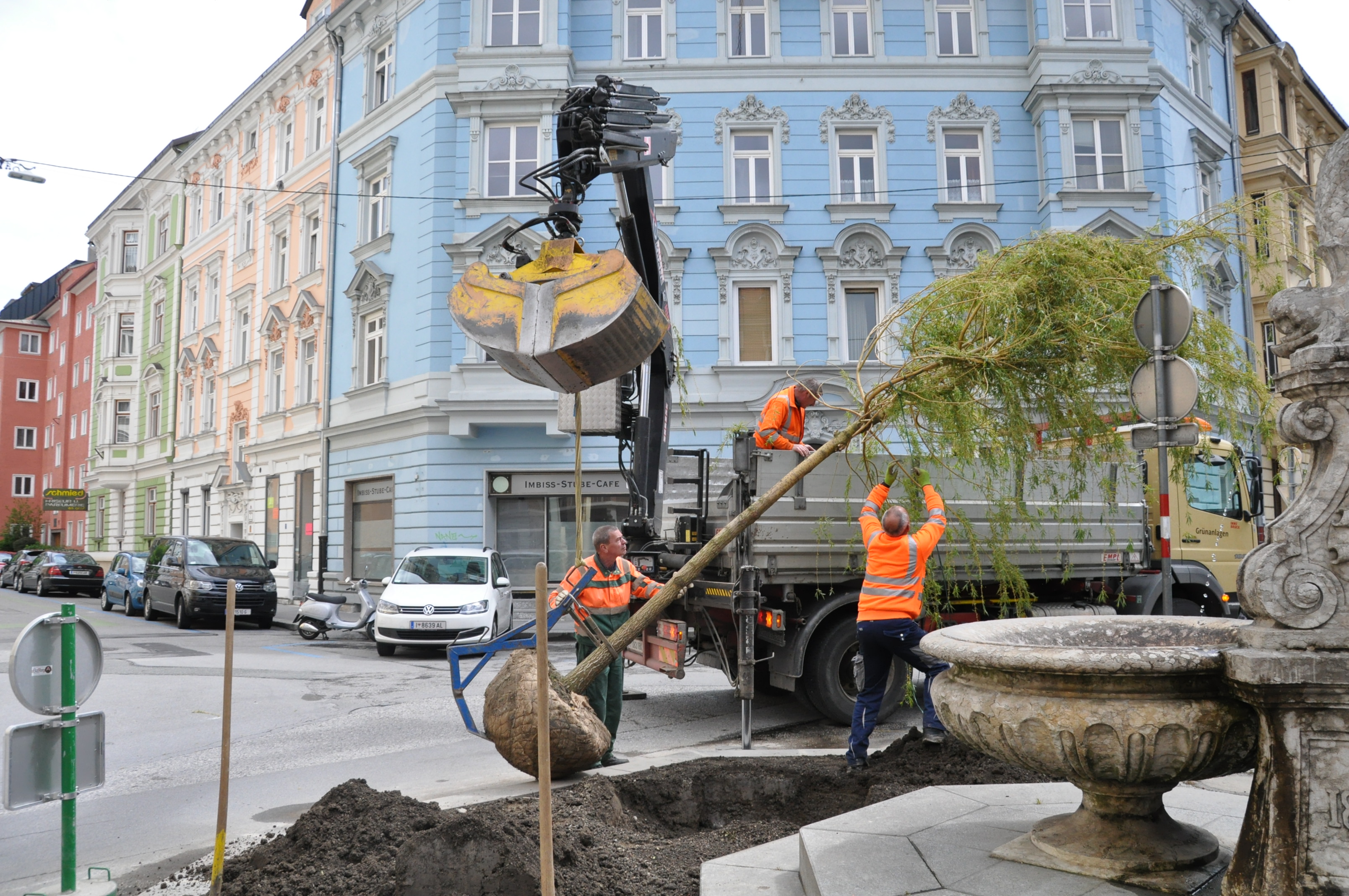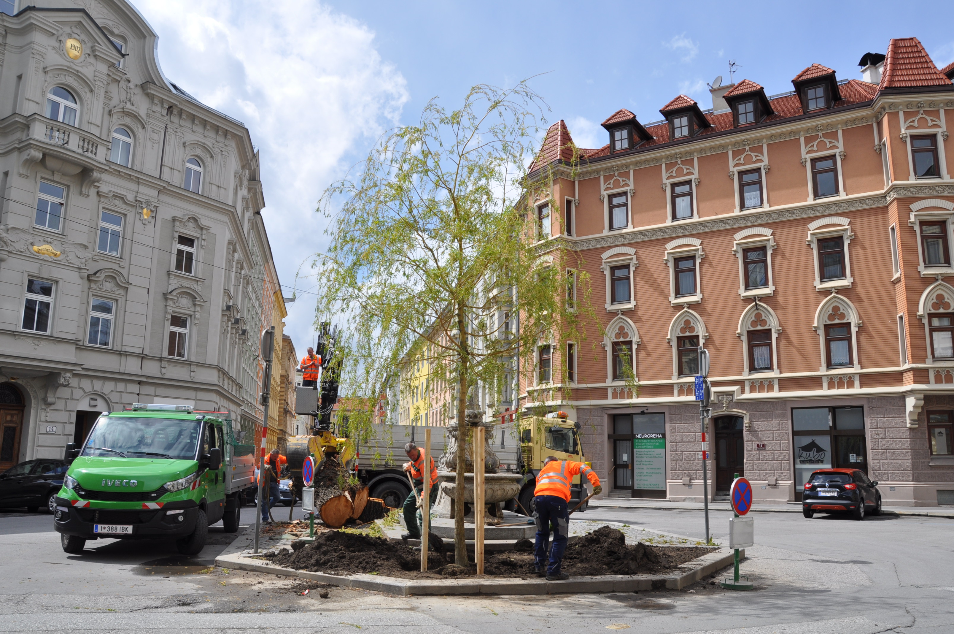 Mit einem Stammumfang von knapp 35 Zentimetern und einer Höhe von sechs Metern steht in der Sonnenburgstraße im Innsbrucker Stadtteil Wilten nun eine neue Trauerweide. Die Mitarbeiter des Amtes für Grünanlagen pflanzten heute den neuen Baum am Kreisverkehr in Wilten ein. Das Team des Amtes für Straßenbetrieb reparierte zuvor noch die Steineinfassung des Platzes.