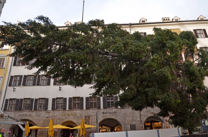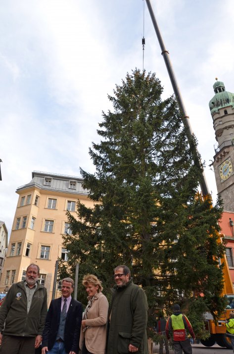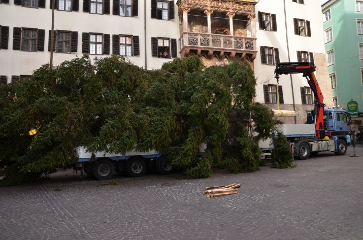 Jetzt steht sie vor der Tür, die besinnlichste Zeit des Jahres. Aus diesem Anlass wurde am 4. November eine 50 Jahre alte, 21 Meter hohe und 5,2 Tonnen schwere heimische Fichte aus einem Privatgarten am Mitterweg vom Amt für Land- und Forstwirtschaft am Vorplatz des Goldenen Dachls aufgestellt. Auch heuer ist der Baum wieder sichtbarer Mittelpunkt des Christkindlmarktes.