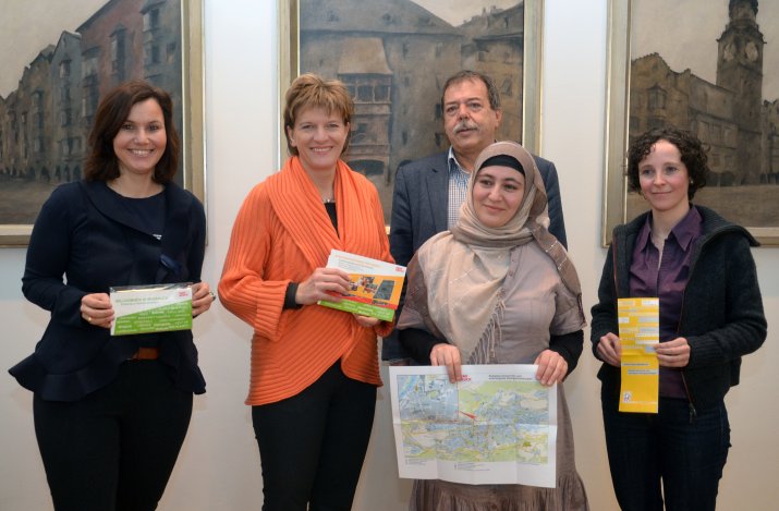 In einem „Willkommenspaket“, bestehend u.a. aus einem Willkommensbrief der Bürgermeisterin und einem Informationsfolder des Bürgerservice, macht eine ansprechende Postkarte auf die Stadtführungen aufmerksam. Das Paket wird an jede/r neuen BürgerIn bei der Anmeldung im Meldeamt vergeben. Die Anmeldung zu den Willkommensspaziergängen erfolgt über die Integrationsstelle. Auf Anfrage werden nach Möglichkeit DolmetscherInnen für die einzelnen Rundgänge organisiert.