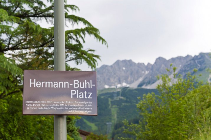 Erinnerte bisher schon einer Gedenktafel an der Bergstation Seegrube der Nordkettenbahn an den berühmten Bürger der Stadt, so werden Einheimische und Gäste nun auch an der Talstation auf der Hungerburg mit Buhls Erfolgsgeschichte vertraut gemacht. Der Vorplatz der Seilbahnstation heißt seit dem 2. Juli „Hermann-Buhl-Platz“. Nicht nur eine Glastafel mit Kurzbiografie und Tourenüberblick sondern auch das großartige Panorama, das den Blick auf Innsbruck, aber auch auf Buhls „Trainingslager“, die Nordkette mit dem Karwendel, öffnet, sind ein würdiges Gedenken.