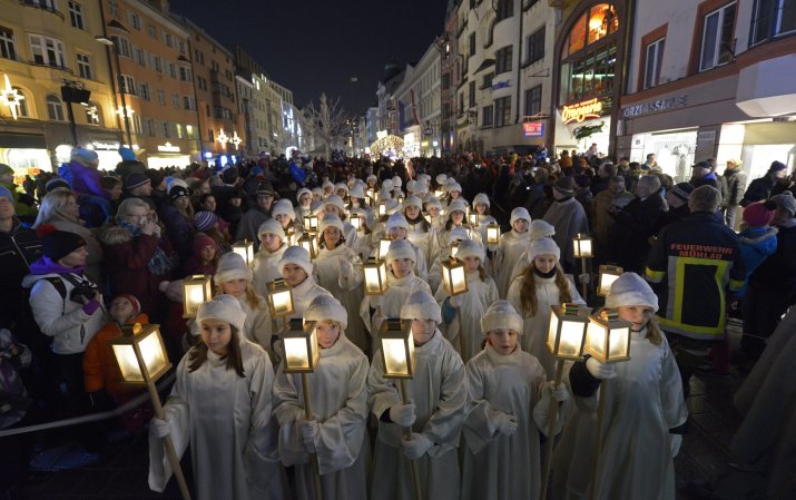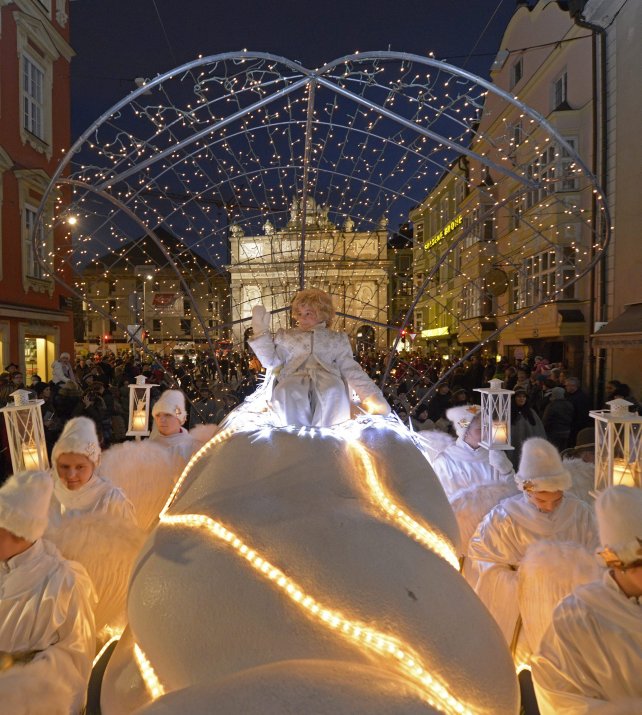 Um 17.00 Uhr setzt sich dann der feierliche Zug in Bewegung. Von der Triumphpforte führt der Weg über Maria-Theresien-Straße, Marktgraben, Herzog-Otto-Straße und Herrengasse bis zum Platz vor dem Tiroler Landestheater und bietet so reichlich Gelegenheit, den gesamten Zug zu bestaunen. Die Hirten und Engel mit ihren Laternen bringen einen warmen Lichterglanz in die Innenstadt und bereiten den Weg für das Christkind in seinem strahlenden, prunkvollen Wagen. An zwei Stationen (Rathaus, ca. 17.20 Uhr, und Marktplatz, ca. 17.40 Uhr) werden die traditionellen Lieder „Jetzt fangen wir zum Singen an“, „Kommet ihr Hirten“ und „Es wird scho glei dumpa“ gesungen, die sich als vorweihnachtliche Klangwolke über die Innsbrucker Innenstadt legen.