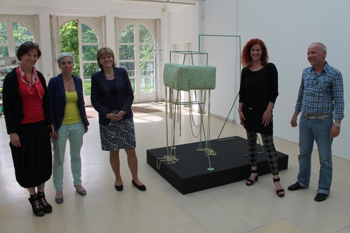 Geschäftsleiterin und Kuratorin Ingeborg Erhart, die Vorstandsmitglieder Katharina Cibulka, Lizzy Fidler und Christoph Hinterhuber führten Bürgermeisterin und Kulturreferentin Mag.a Christine Oppitz-Plörer durch die noch bis 24. Mai laufende Ausstellung „There Are More Things“ der Wiener KünstlerIn Jakob Lena Knebl, die die Fragen „Was ist Design, was ist Kunst?“ und „Was ist der Körper, was ist Identität?“ aufwirft.