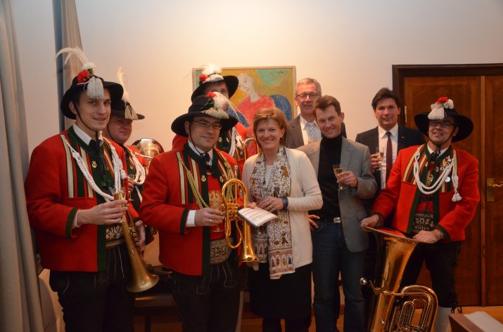 Roland Tanzer (Präsident der Wiltener Stadtmusikkapelle), Claudius Schlenck MBA (Obmann der „Wiltener“) und Peter Kostner (Kapellmeister) überbrachten gemeinsam mit fünf Musikanten die offiziellen Weihnachtsgrüße der Stadtmusikkapelle. Traditionell luden die „Wiltener“ die Bürgermeisterin auch dieses Jahr zum „Feuerwerk der Blasmusik“ am 29. Dezember um 17 Uhr im Congress ein. „Dieser Termin ist zu einem fixen Bestandteil im Konzertkalender geworden“, freute sich das Stadtoberhaupt.