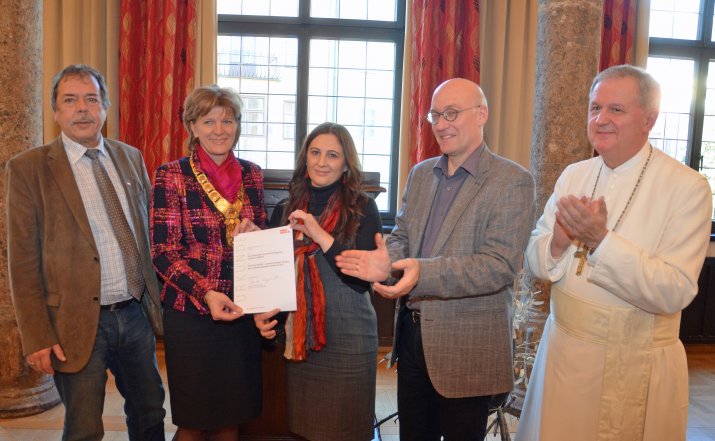 Seit 2008 vergibt die Stadt Innsbruck jährlich einen Preis an Personen oder Institutionen, die sich im täglichen Leben um die Integration von Zugewanderten besonders verdient gemacht haben. Bürgermeisterin Mag.a Christine Oppitz-Plörer und der für Integration ressortzuständige Stadtrat Mag. Gerhard Fritz verliehen den Preis am 10. Dezember an den „Interkulturellen Gemeinschaftsgarten Innsbruck-Wilten“. Vor zahlreichen Gästen, Gemeinderätinnen und städtischen MitarbeiterInnen würdigte auch Abt Mag. Raimund Schreier das Gemeinschaftsprojekt im Historischen Rathaus.