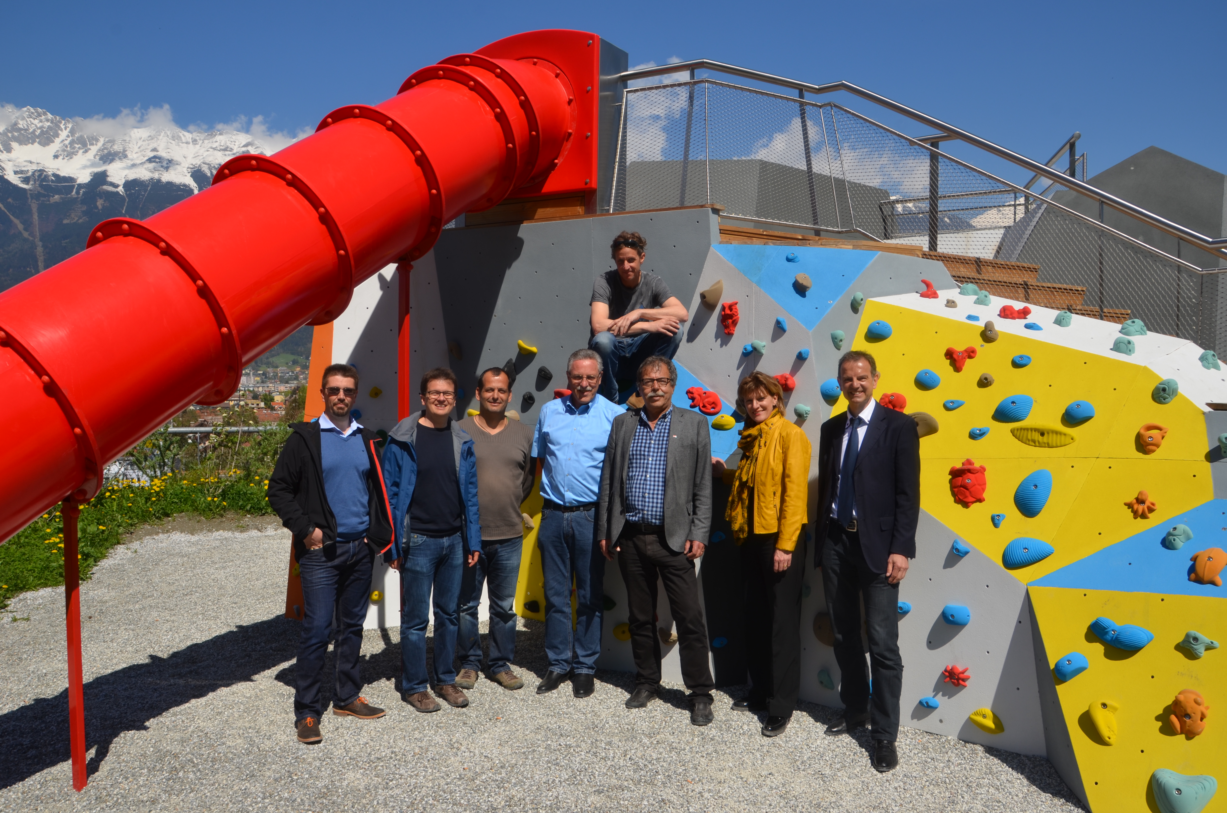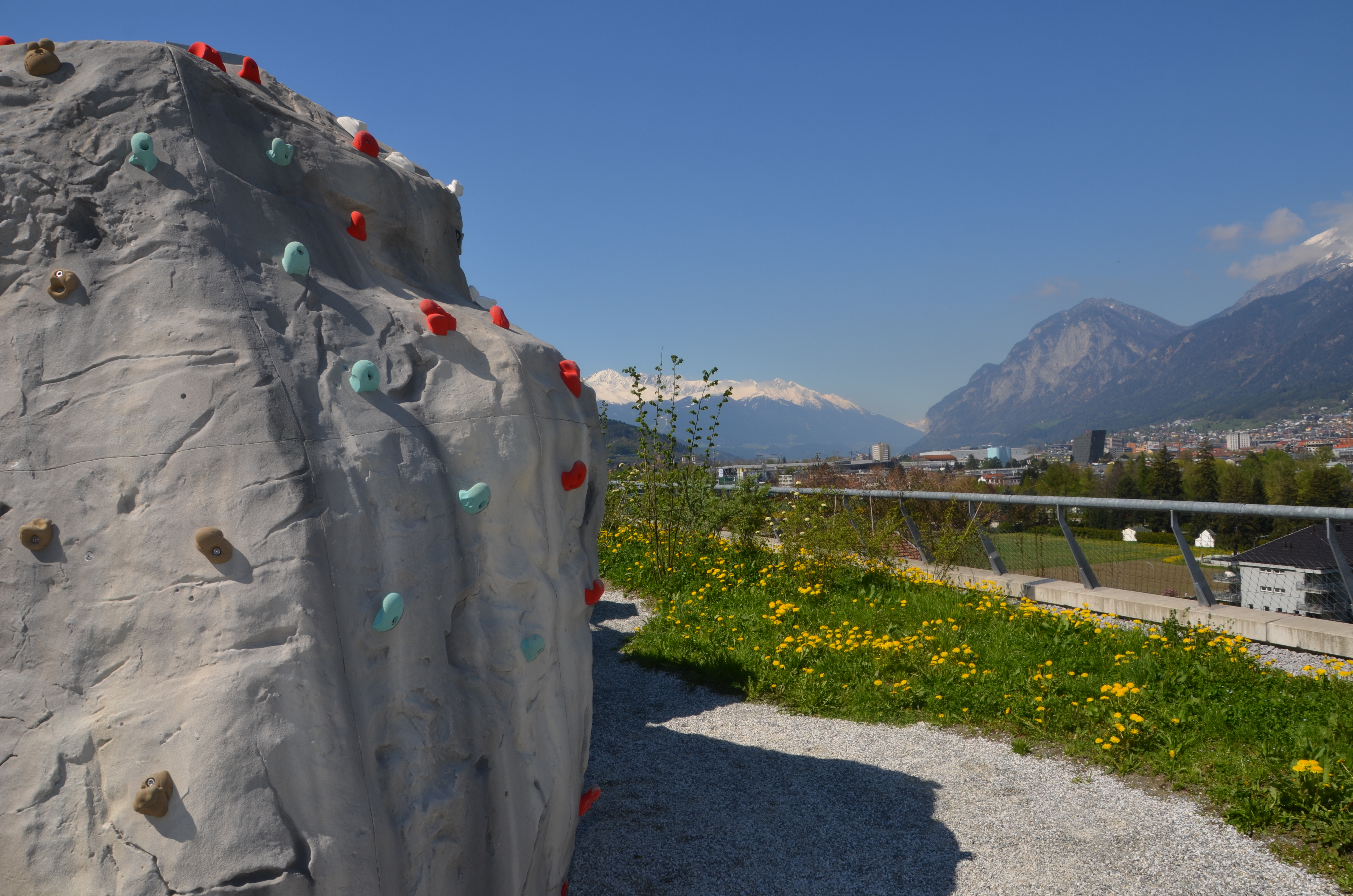 Die Einhausung der Autobahn A12 in Amras trägt nicht nur positiv zur Lärmbewältigung bei, sie entwickelt sich immer mehr zur grünen Oase für jede Altersklasse. Nach der Fertigstellung des Spielplatzes für Kleinkinder 2014, konnte nun auch die Boulderanlage eröffnet werden. Diese überzeugt durch eine ganz besondere Optik.
