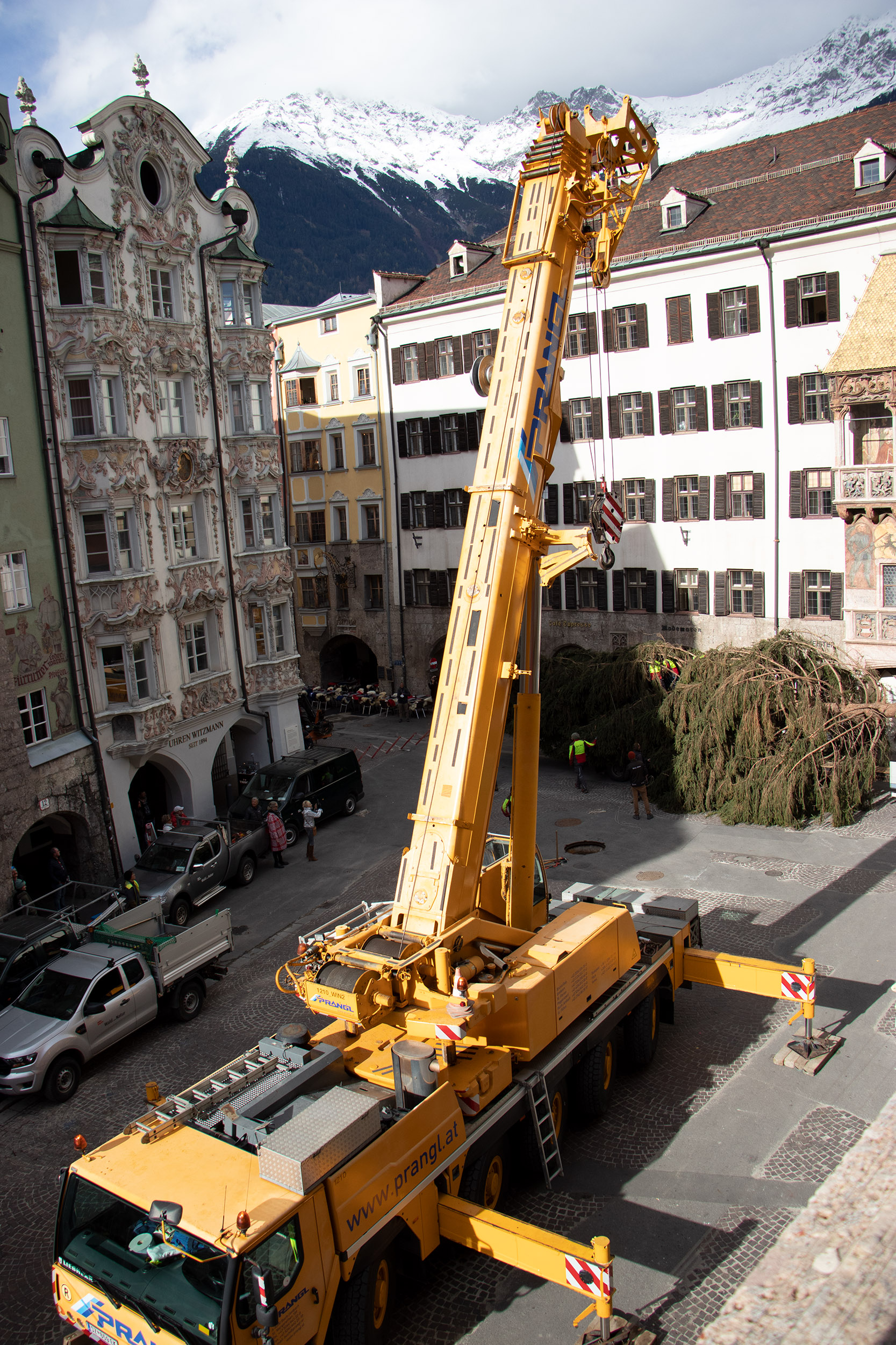 Bereits seit 1934 steht er symbolisch für die Vorfreude auf das Weihnachtsfest in der Innsbrucker Altstadt: der städtische Christbaum vor dem Goldenen Dachl. Auch heuer thront er wieder im Zentrum des Christkindlmarkts. Gefunden wurde der Weihnachtsbote – eine imposante Fichte – in einem Schrebergarten im Süden Pradls vom Amt für Wald und Natur. Für die sichere Aufstellung sorgten zehn Mitarbeiter und ein Kran.