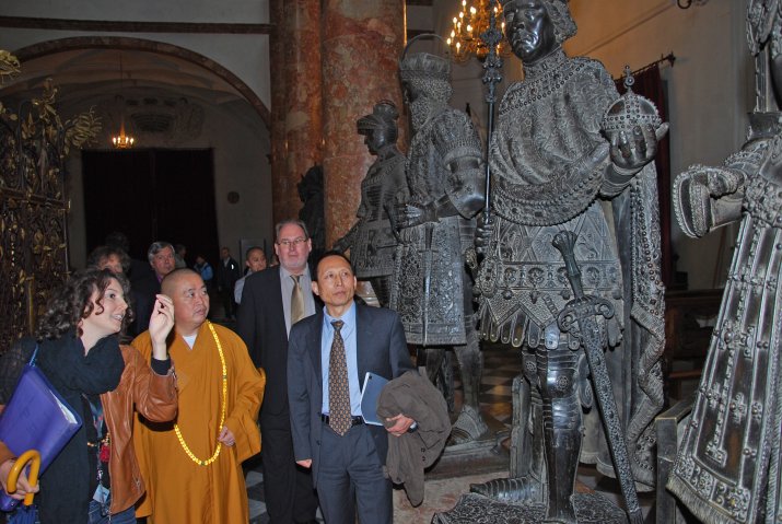 Nach dem Mittagessen begleitete Stadtführerin Julia Strauhal Seine Heiligkeit durch die Altstadt, wo die Gäste unter anderem das Goldene Dachl und die Hofkirche mit den „Schwarzen Mandern“ kennenlernten. Beeindruckt zeigte sich die chinesische Delegation auch vom Panorama der schneebedeckten Berge.