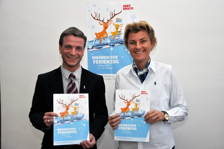 Kinder- und Jugendreferent Vizebürgermeister Christoph Kaufmann und Mag.a Birgit Hofbauer (Referentin des Amtes für Kinder- und Jugendförderung) präsentierten das neue Programm. „Das Angebot der familienfreundlichen Stadt Innsbruck wird durch den Ferienzug um eine wichtige Facette erweitert, die aus dem Schul- und Ferienjahr nicht mehr wegzudenken ist“, so Vizebürgermeister Kaufmann über das abwechslungsreiche Programm: „Auch für berufstätige oder alleinerziehende Mütter und Väter ist es beruhigend zu wissen, dass ihre Kinder während der Ferienzeit gut aufgehoben sind, Spaß haben und ihre freien Tage in der Gesellschaft von Freunden genießen können.“
