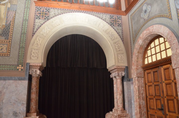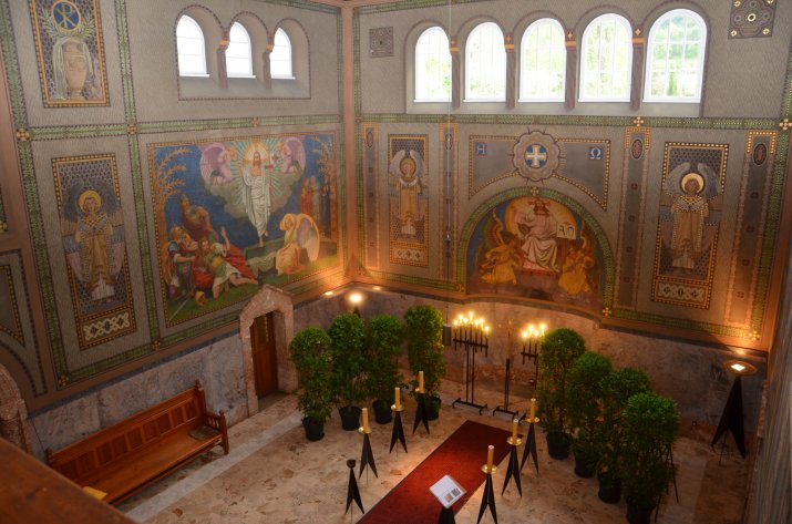 Die Gedenkkapelle wurde nach Plänen von Eduard Klingler (damals Leiter des Stadtbauamtes) in den Jahren 1912-1916 erbaut. „Es wurden nicht nur das Gemälde sowie die Holzdecke gereinigt und die Schadstellen restauriert, sondern wir haben auch den Samtvorhang am Eingang erneuert, sodass die Halle nun auch wieder den entsprechend würdigen Rahmen für Trauerfeierlichkeiten bietet“, erklärte Alexander Legniti.