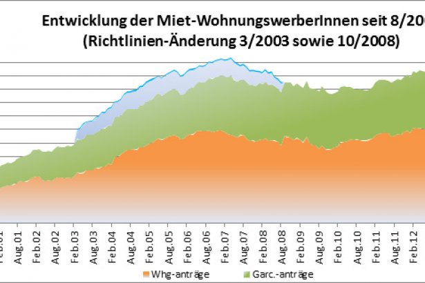Die Ursachen für den starken Anstieg an WohnungswerberInnen bis Februar 2007 liegen einerseits in der verbesserten Zugangsmöglichkeit durch die Änderung der Vergaberichtlinien 2003 und 2008, andererseits auch in der Anhebung der Einkommensgrenzen nach der Umstellung der Wohnbauförderungsrichtlinien im Jahr 2003.