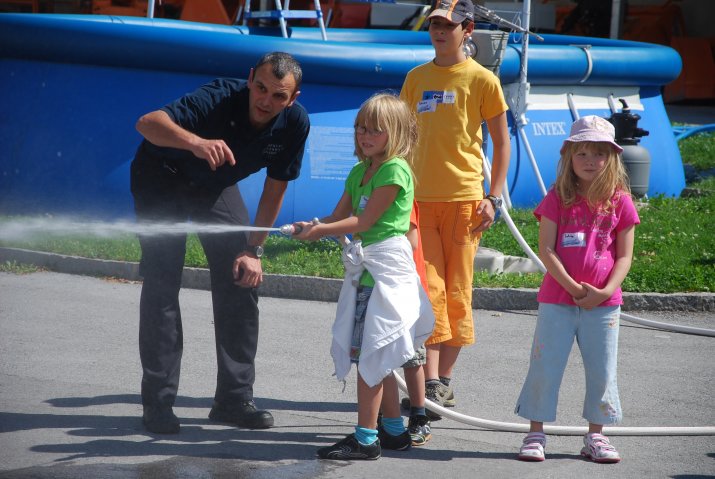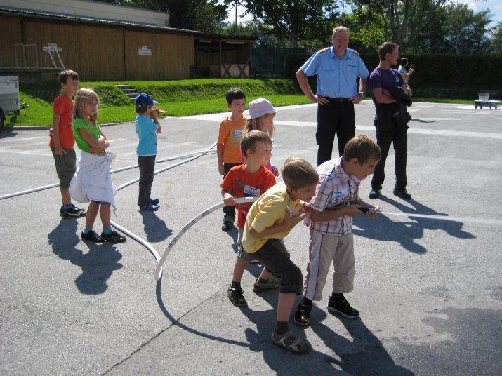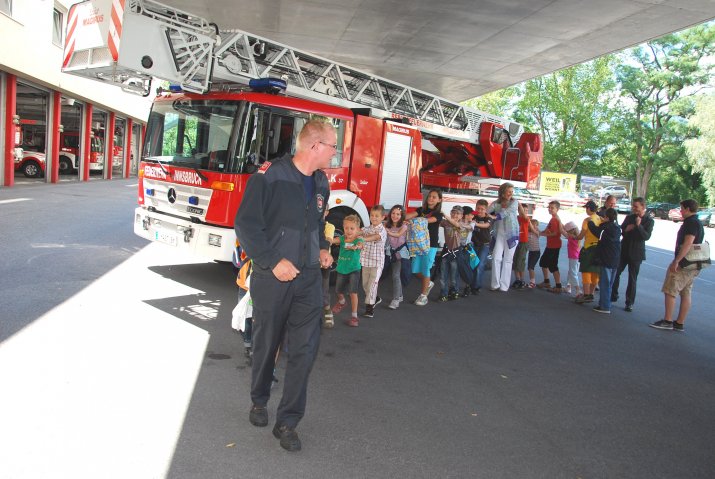 Das Ferienzugprogramm ist vielfältig, die Kinder können sich sportlich, kreativ oder auch als kleine Wissenschaftler betätigen. „Der Besuch von Blaulichtorganisationen ist sehr beliebt“, weiß Birgit Hofbauer vom städtischen Referat für Kinder und Jugendförderung. Daher war natürlich auch der Besuch bei der Berufsfeuerwehr am 10. August sehr gefragt. Feuerwehrmann Bernhard Egger erzählte den Ferienzuggästen anschaulich alles rund um die Feuerwehr und das Verhalten im Notfall. Die Kinder erfuhren dabei, dass die Feuerwehr nicht nur kommt, wenn es brennt, sondern auch bei Autounfällen, Hochwasser, etc. Feuerwehrautos wurden besichtigt und sogar „hineinkraxeln“ war erlaubt. Auch einen echten Alarm erlebten die jungen Gäste und staunten, wie flink die Berufsfeuerwehrmänner mit dem Einsatzfahrzeug davonbrausten. Höhepunkt des zweistündigen Programms waren aber eindeutig die Löschübungen, bei denen es galt, zielgenau zu spritzen und mit einem Feuerlöscher echte Flammen zu bekämpfen.