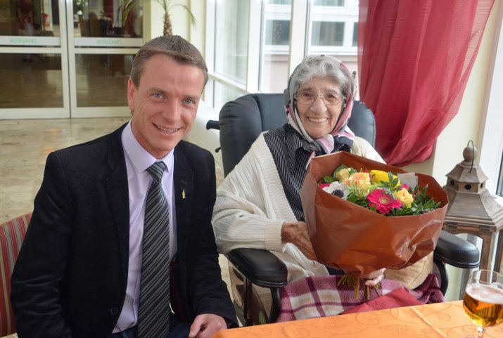 „So schöne blaue Augen hab ich ja noch nie gesehen“, mit diesen Worten begrüßte Elisabeth Bogner Seniorenreferent Vizebürgermeister Christoph Kaufmann, der ihr am 20. März im Wohnheim Pradl zu ihrem 100. Geburtstag die Grüße der Stadt Innsbruck und einen bunten Blumenstrauß überbrachte.