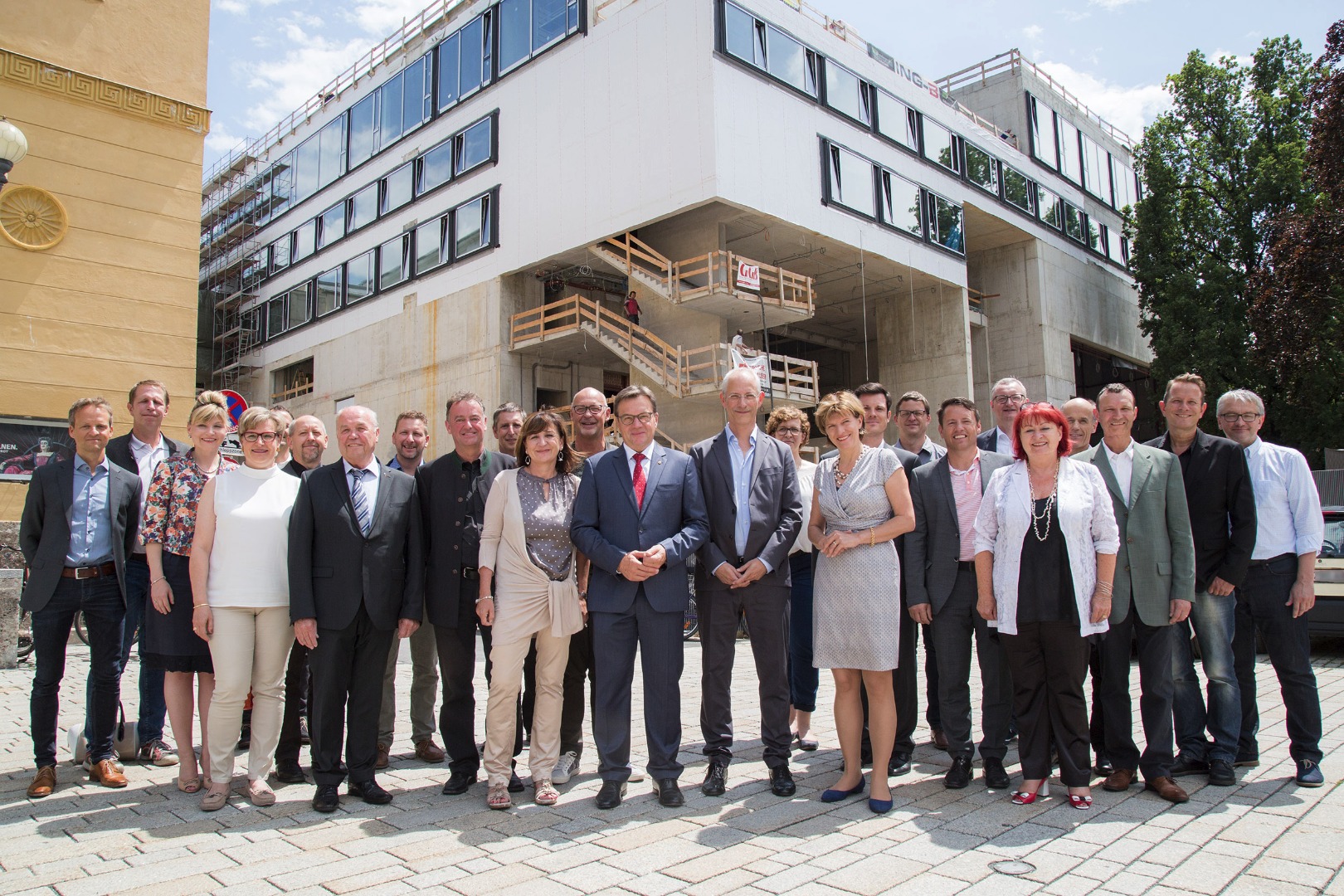 Ende Juni hatten nicht nur Landeshauptmann Günther Platter, Kulturlandesrätin Dr.in Beate Palfrader und Bürgermeisterin Mag.a Christine Oppitz-Plörer, sondern auch die zukünftigen NutzerInnen die Gelegenheit, den im Mai ausgewählten neuen Leiter des Kulturbaus, Mag. Wolfgang Laubichler, kennenzulernen. Gastgeber war das Tiroler Landestheater mit Intendant Johannes Reitmeier und Direktor Dr. Markus Lutz. Neben persönlichen Gesprächen stand auch ein gemeinsamer Rundgang durch die Baustelle des Hauses der Musik Innsbruck auf dem Programm. Laubichler zeigte sich dabei von Innsbruck und seiner künftigen Arbeitsstätte begeistert: „Das Projekt Haus der Musik Innsbruck ist für mich etwas Einmaliges. Ich bin gewohnt mit unterschiedlichen Nutzer- und Nutzerinnengruppen zu arbeiten und sehe große Potenziale. Für die Vision eines Miteinanders in diesem Haus werde ich mich sehr engagieren. Das Haus der Musik soll etwas sein, auf das die Menschen in Innsbruck stolz sind“, betonte er. KR