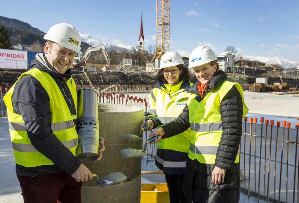 Bis Ende Mai soll der Rohbau des neuen IKEA-Anbaus fertig gestellt sein. Derzeit wird an der Fertigstellung der Bodenplatten gearbeitet. Heute wurde im Beisein von Bürgermeisterin Mag.a Christine Oppitz-Plörer der Grundstein für das neue Gebäude gelegt. Dieser ist ein ganz Besonderer: Er besteht aus einer Metallhülse, die mit einem IKEA-Katalog, einer lokalen Tageszeitung, einer aktuellen Broschüre, einer Hand voll Nägel und noch ein paar anderen kleinen Bauutensilien, befüllt und in eine neue Bodenplatte einbetoniert wurde.